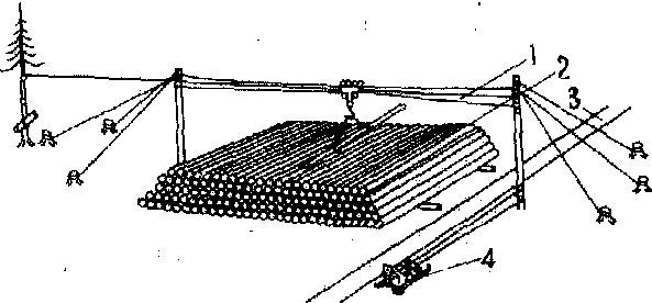 原条装车楞场示意图 ❷装车场:只是汇集从采伐地点集来的木材,直接进行连路装车的场所。汇集来的原木、原条或伐倒木皆直接装车下运;伐倒木也可打枝后下运。 ❸集材接运点:是集材中间改换集材方式或机械的地带,在此是临时性堆放木材,以便衔接上、下段的集材作业。 场地 山上楞场和装车场要求选在到材比较集中,平均集材距离短,而且尽量避开生长良好的幼树群地带;场地平坦,有足够面积;地势干燥,冬季没有冰湖,夏季排水良好、不积水。如有坡度应稍向装车线方向倾斜(原条楞场不超过1°,原木楞场不超过2°)。此外,推河楞场和编排楞场要选在木材能迅速干燥、高水位不致冲走木材、推河及编排方便、向河流方向有5°左右斜坡、在河流曲线段的内侧河岸。原条装车场(或装车楞场)面积随装车机械不同而异,采用架杆起重机装车时为30×40(宽×长)平方米;采用单杆缆索起重机装车时为40×(60~80)平方米。场地周围设30米宽安全带,在一侧有放小规格材和枝桠的场地,其面积按每层积立方米为1平方米计算。集材接运点要求选在能充分发挥上下段集材效率和经济合理的地带。 场内设施 山上楞场和装车场的作业,综合不同工艺方式,有卸木、打枝、造材、剥皮、检尺、选材、归楞、装车或推河和清理场地等工序。其主要设施或设备有:❶卸木—打枝—造材台。台长25米、宽8米,台面上有与选材线垂直、每隔2米铺放直径28~38厘米的垫木,埋入地内一半;如使用时间短,场内设施力求简易,可不铺垫木,只将场地稍加整平即行作业。造材采用汽油动力链锯。 ❷人力选材平车。轨距762厘米。选材线与楞堆用地等长,轨面低于卸木—打枝—造材台0.5米。 ❸架杆起重机或缆索起重机作为归装机械。 ❹装车线。一般修成直线,如受场地限制,也可修成曲线,但汽车路曲线半径不小于50米,森林铁路曲线半径不小于200米;重车方向下坡坡度,汽车路不准超过2.5%,森林铁路不准超过5‰。 |