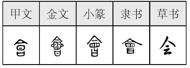 繁体为“會”。金文为象形字,其上为“亼”(jí),中间为“米”,下为三角形,字形与“曾”相似,也是做饭的工具。引申为聚,另读kuài(《集韵》“古外切”),会计。作声符生成的字有: