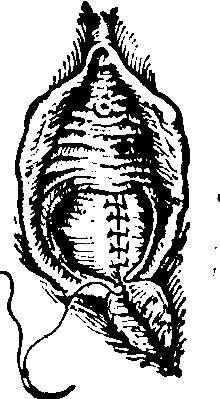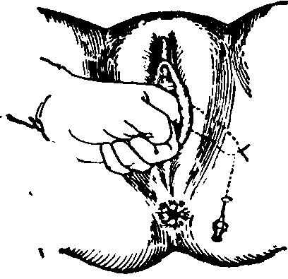 图1 会阴切开术类别 切开会阴时间如为自然分娩,应在宫缩时先露部拨露3~4cm或助产手术前。过早切开,出血及感染机会多;过迟,盆底软组织过于伸张而撕裂。 一般用阴部神经阻滞及局部浸润麻醉。切开长度一般在4~5cm (图2)。缝合时分阴道粘膜,肌肉筋膜,脂肪及皮肤四层缝合。阴道粘膜与肌肉筋膜层用0号或00号铬制肠线缝合,皮肤及皮下脂肪用Ⅰ号丝线。不要留有死腔,皮肤缝线不宜过紧,以防丝线嵌入皮肤(图3)。