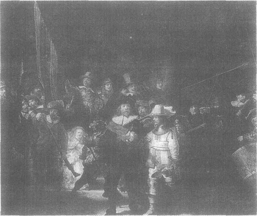 | 释义 | 伦勃朗《夜巡》 伦勃朗《夜巡》这幅巨画描绘了差不多和真人大小的许多人物,表现的是阿姆斯特丹射击手连的队员们,在班宁 ·科克上尉指挥下行军出城的情形。看去像是刚刚接到命令的射手队员们,正匆匆忙忙整队出发。鼓手在敲打着不成调子的鼓声,城门口杂沓拥挤。虽然有人用长枪在竭力维持秩序,慌乱中两个女孩似乎还是被弄得蒙头转向,还可以看到一条狗在人前人后到处乱窜。嘈杂的脚步声、说话声、犬吠声,连成了 一片。