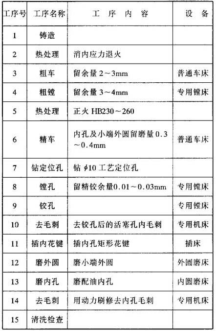 (2)转子加工工艺过程 转子是QJM型液压马达的重要部件,配流轴及活塞都安装在转子件上,在编制工艺规程时应注意以下几点: ·确保铸件牌号,无任何砂孔、缩孔及气泡等铸造缺陷。 ·热处理正火时,要注意散热均匀,保温时间要适当延长。 ·在加工10孔或20孔活塞孔时,要尽量降低其表面粗糙度值,因此,最后二精铰工序采用金刚石铰刀加工。 ·配油内孔与各活塞孔之间的毛刺必须去净,但又不能倒角,所以,在内孔磨削加工完后的去毛刺工序也是该零件的关键工序。 其加工过程见表37.6-2。 表37.6-2 转子工艺过程表