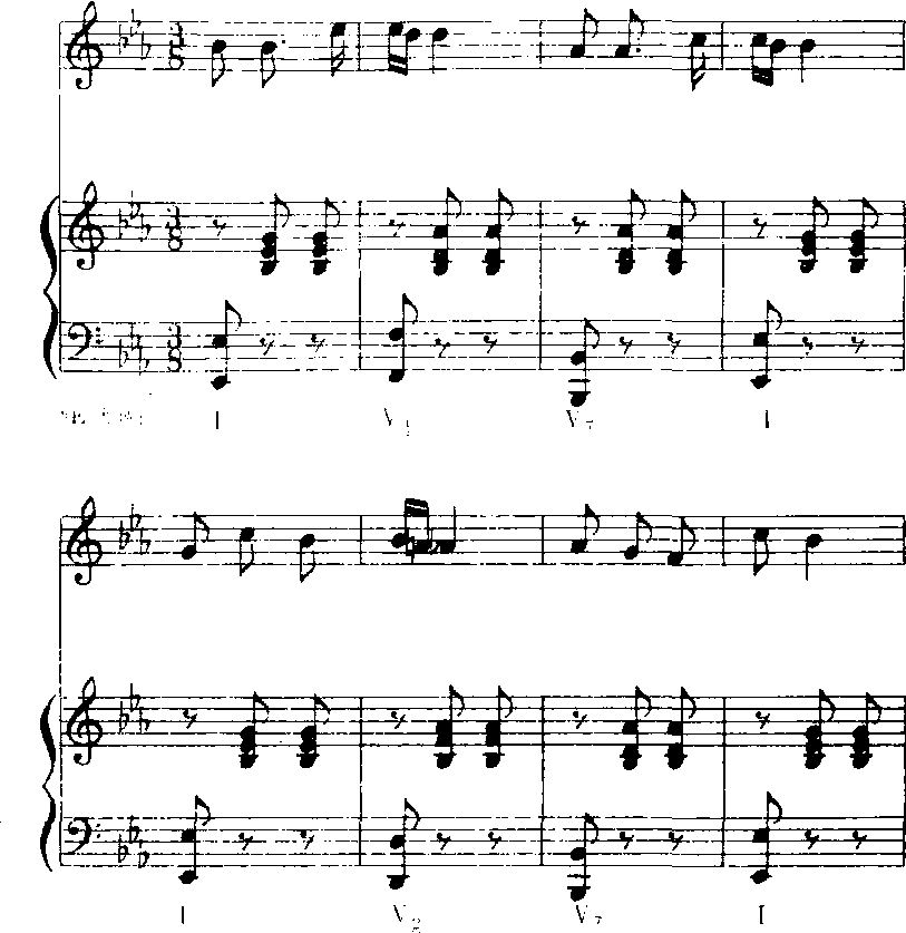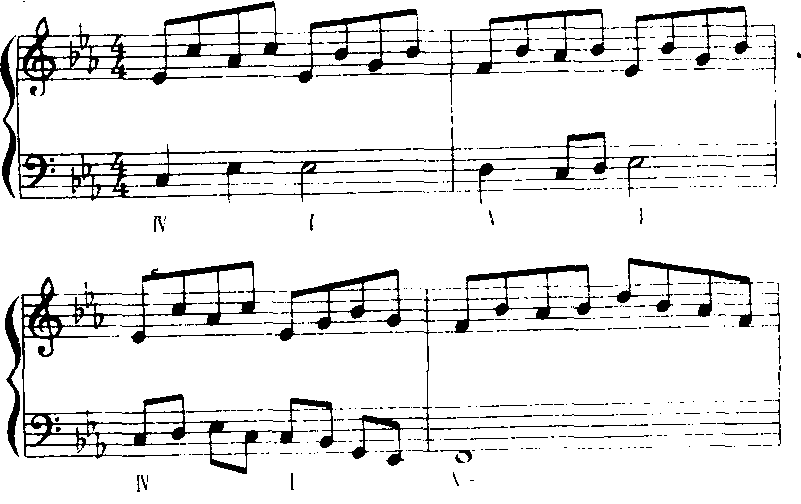 但有时为了歌曲色彩、形象、情感等方面的对比与变化,也可以把主旋律放在低声部,由左手弹奏,而右手在高声部弹奏和弦节奏型。例《送别》(b)的另一个片断: