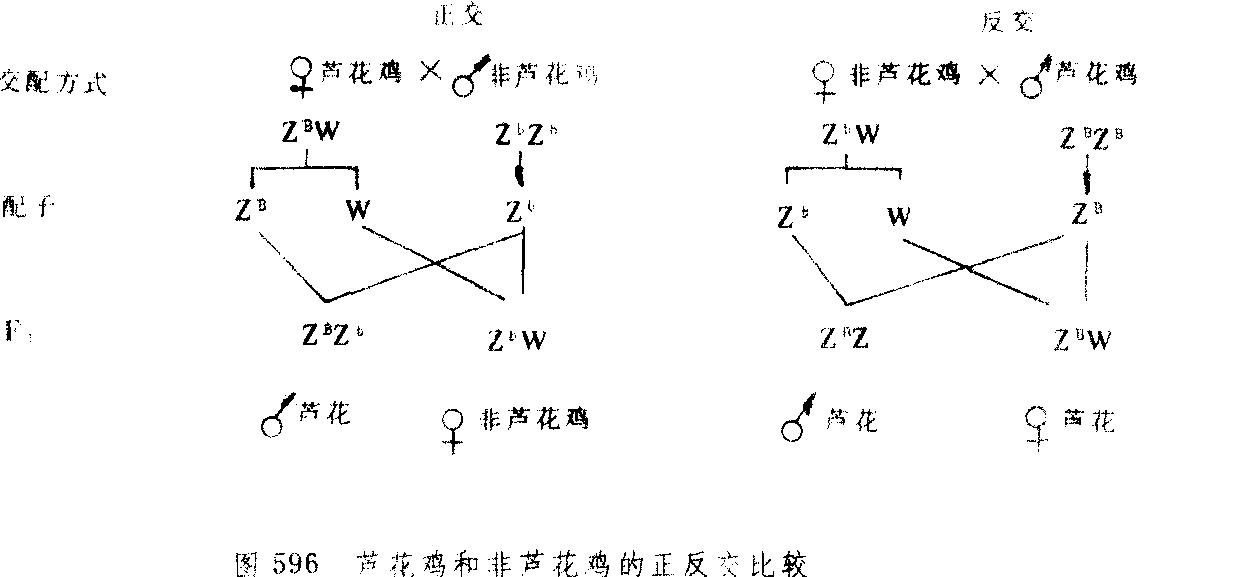 | 释义 | 伴性遗传 伴性遗传banxing yichuan位于性染色体上的基因及其所控制性状的遗传,简称性连锁。分不完全性连锁和完全性连锁两种类型。前者是,例如在X和Y染色体上有同源部分,因此可借互换(参见“互换”条)打破原来的基因连锁关系,而使有关基因成为不完全的性连锁。后者是,例如在X和Y染色体上的非同源部分,由于不能配对而不能互换,因此这部分的那些基因,就会维持原来的连锁关系而表现完全的性连锁。伴性遗传在育种上具有重要意义。例如,为了多养母鸡,最好在幼鸡就把公鸡淘汰而保留雌鸡;利用芦花羽毛的伴性遗传即可办到(图596)。只要用芦花母鸡与非芦花公鸡交配,后代孵化的小鸡,凡芦花羽毛的全是雄鸡,非芦花羽毛的全是雌鸡,就可准确区分雌雄小鸡。但反交不能,因为F1,不论雌雄,全为芦花鸡。养蚕业需要雄蚕。因雄蚕不会把养料消耗在产卵上,吃桑叶少,吐丝多,且质量高。利用油蚕(皮肤具有油样纸的透明度)的伴性遗传(与芦花鸡的相同),可达到养雄蚕的目的。正常雌蚕与雄性油蚕杂交,F1中凡是雄蚕全为正常,雌蚕全为油蚕。于是,根据油蚕皮肤就可保留雄蚕,淘汰雌蚕。
