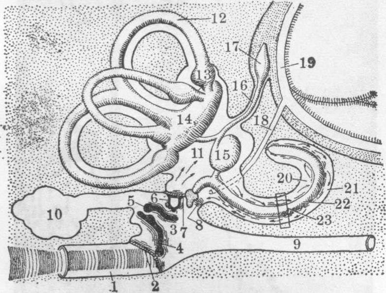 1.外耳道 2.鼓膜 3.鼓室 4.锤骨 5.砧骨 6.镫骨 7.卵圆窗 8.圆窗 9.咽鼓管 10.乳突腔 11.前庭 12.半规管 13.壶腹 14.椭圆囊 15.球囊 16.内淋巴管 17.内淋巴囊 18.外淋巴管 19.蛛网膜下腔 20.前庭阶 21.鼓阶 22.耳蜗管(中阶) 23.耳蜗