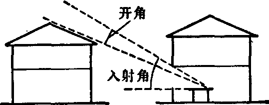 ❶采光系数,指窗玻璃面积与室内地面积之比,这种系数根据房间用途的不同而异。起居室、工作室为1:8~1:10。走道、楼梯、储藏室等为1:10~1:12。采光系数没有考虑到周围建筑物和树木阴影等的影响,因此采光系数相同的两个房间由于上述条件不同,会得到差别很大的采光效果。为了考虑对面建筑物的阴影作用,在采用采光系数这一指标时要补充入射角和开角两个指标的要求。入射角指室内工作点水平平面与采光口上缘的连线所形成的夹角。开角即室内工作点与对侧遮光物最高点的连线和工作点与采光口上缘连线之间所夹的角(如下图所示)。一般规定入射角不应小于27°,开角不应小于4°。