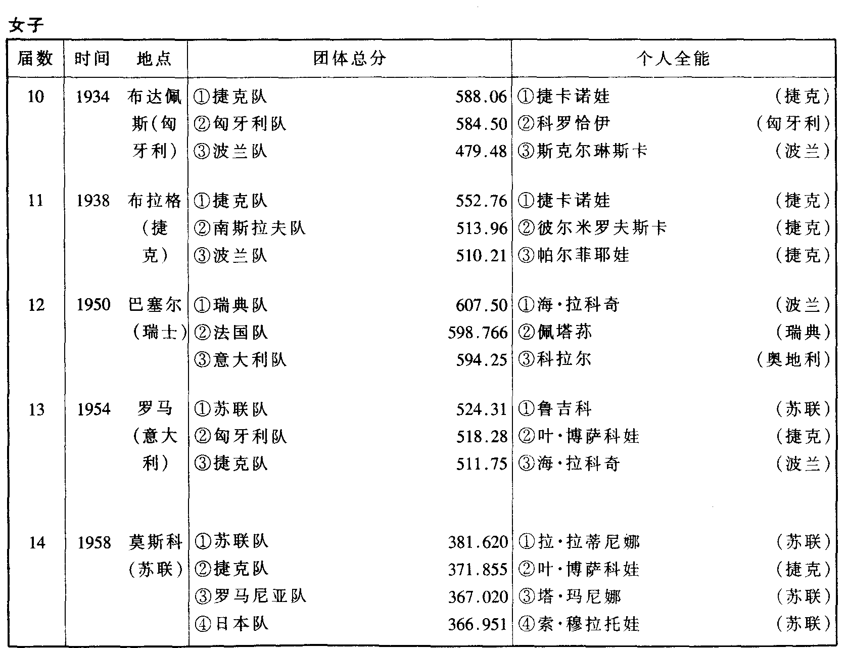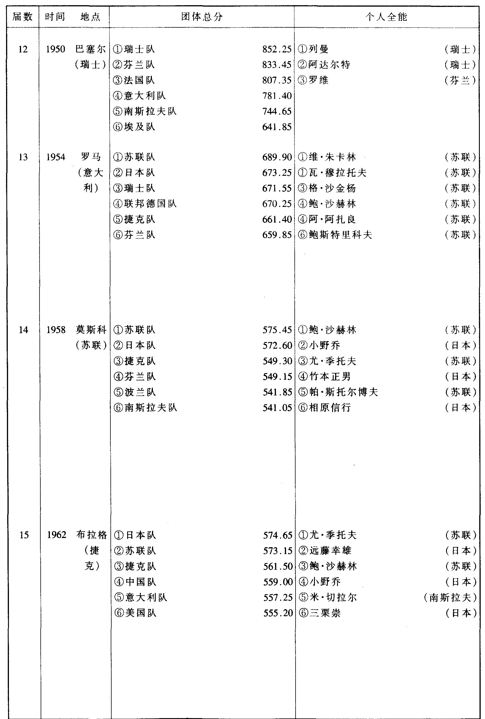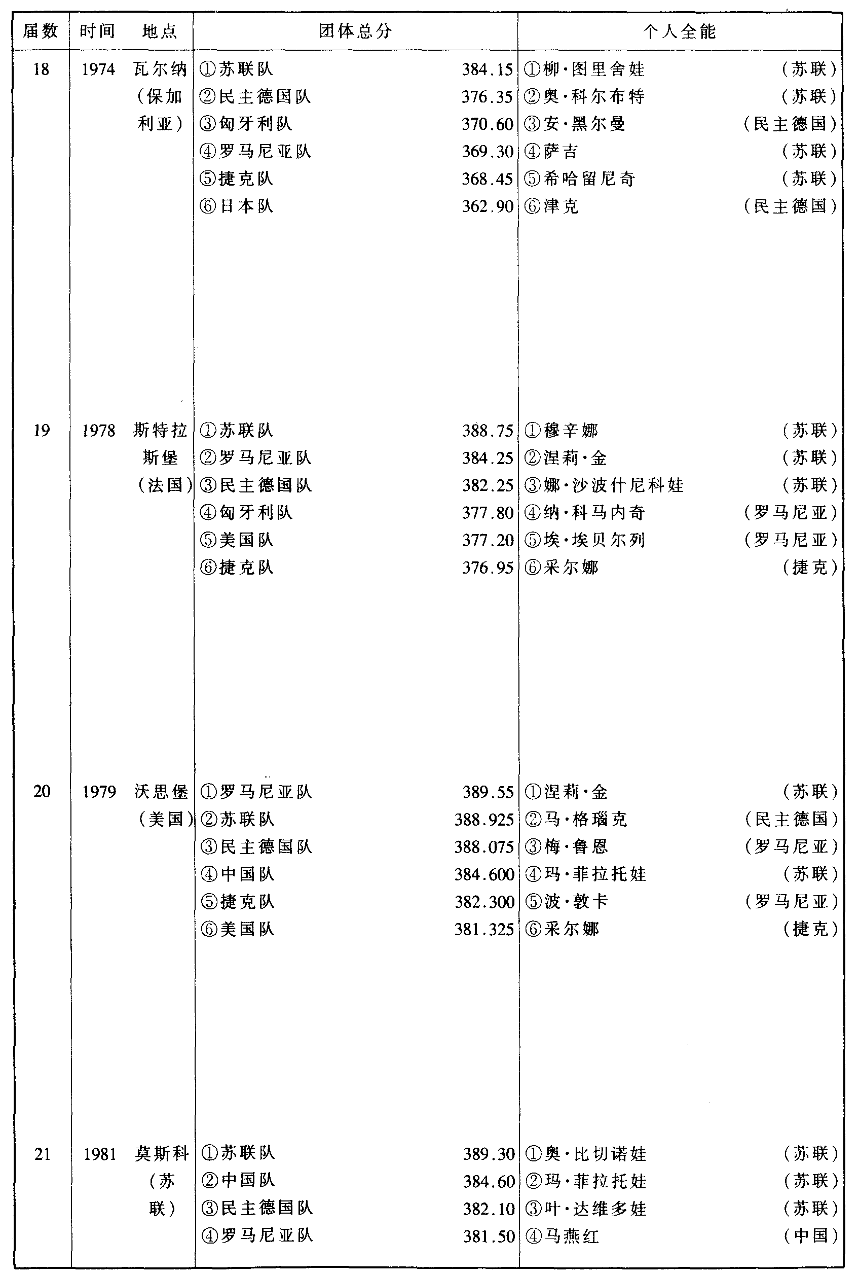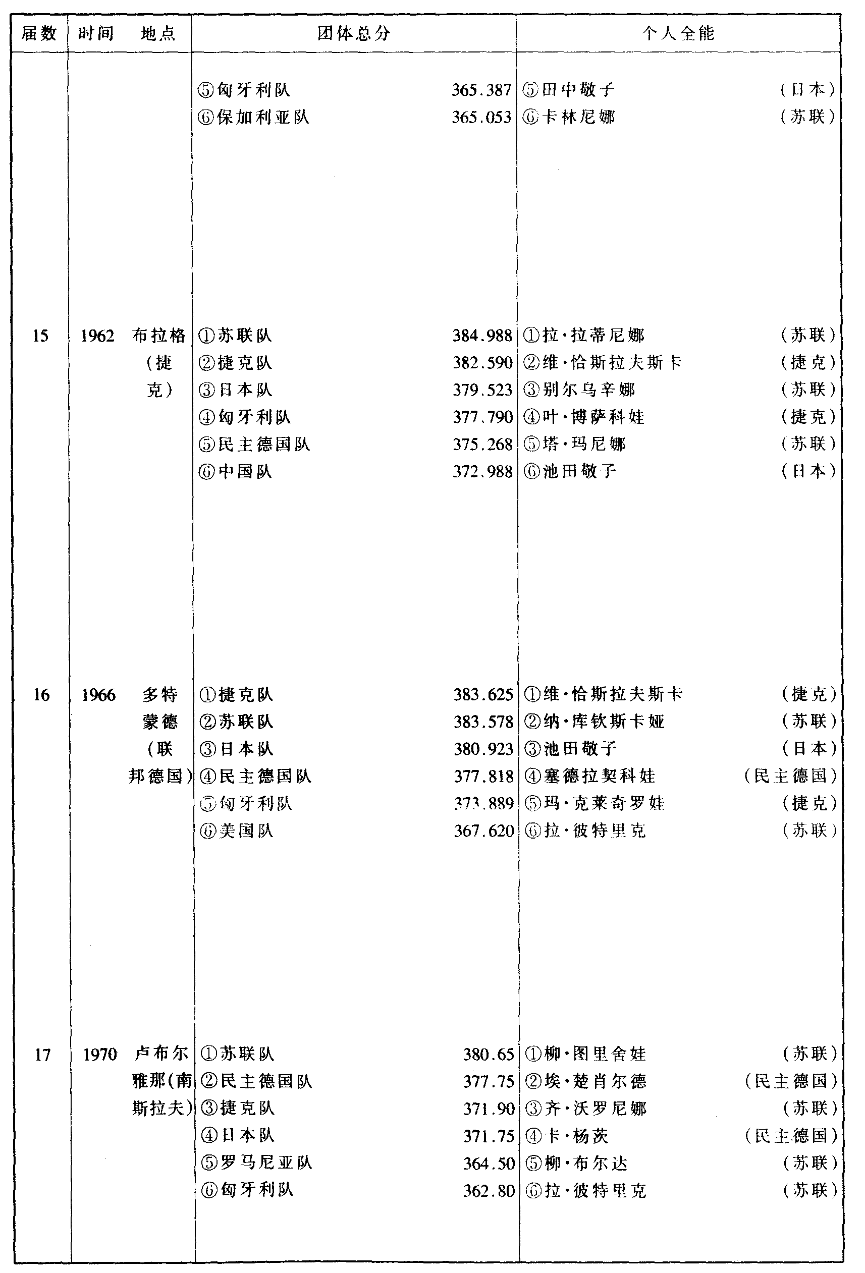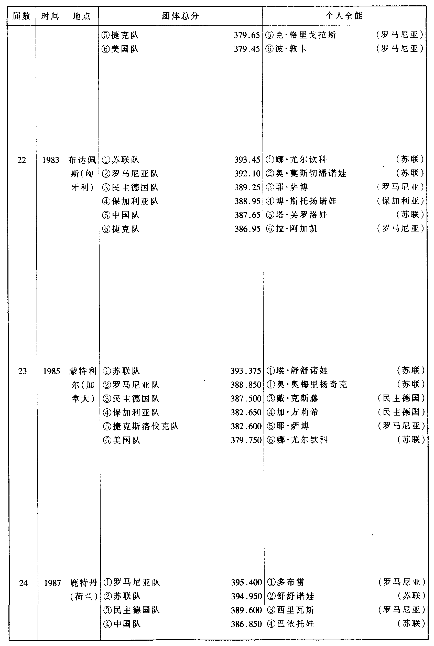 历届世界体操锦标赛比赛成绩