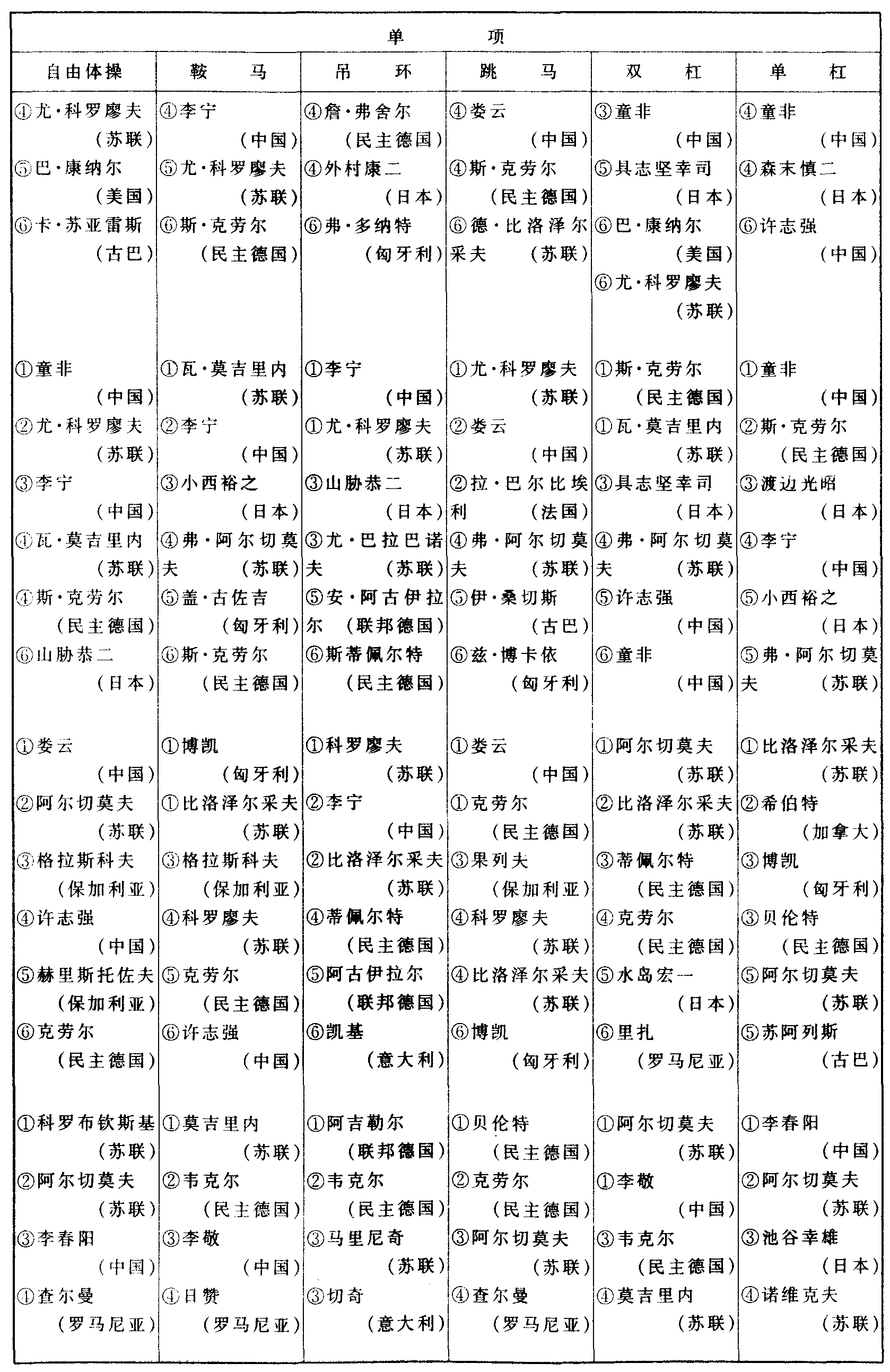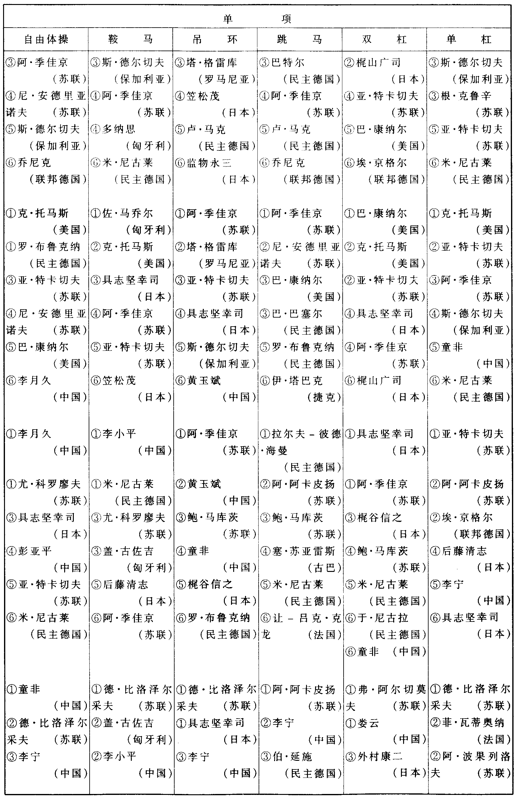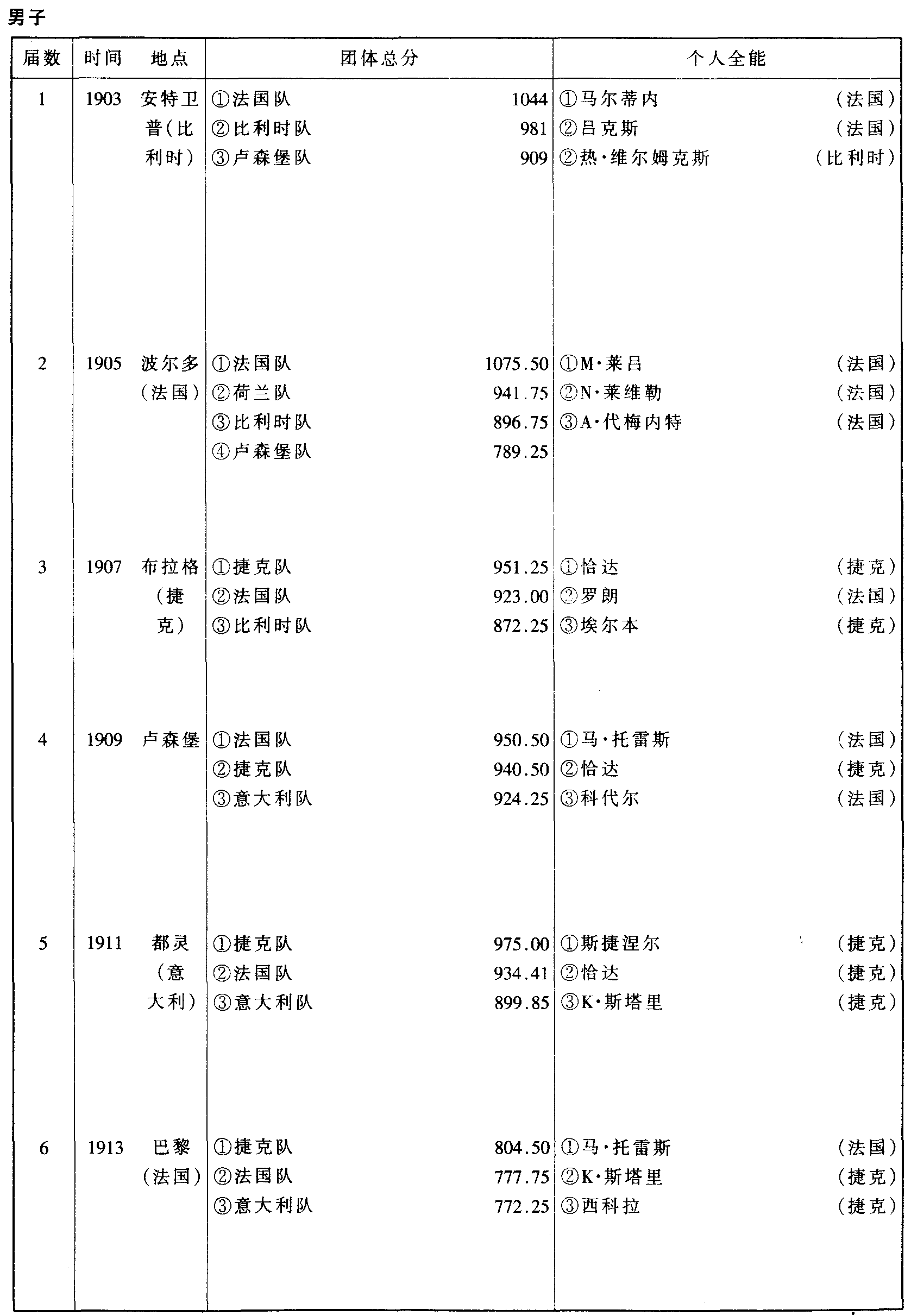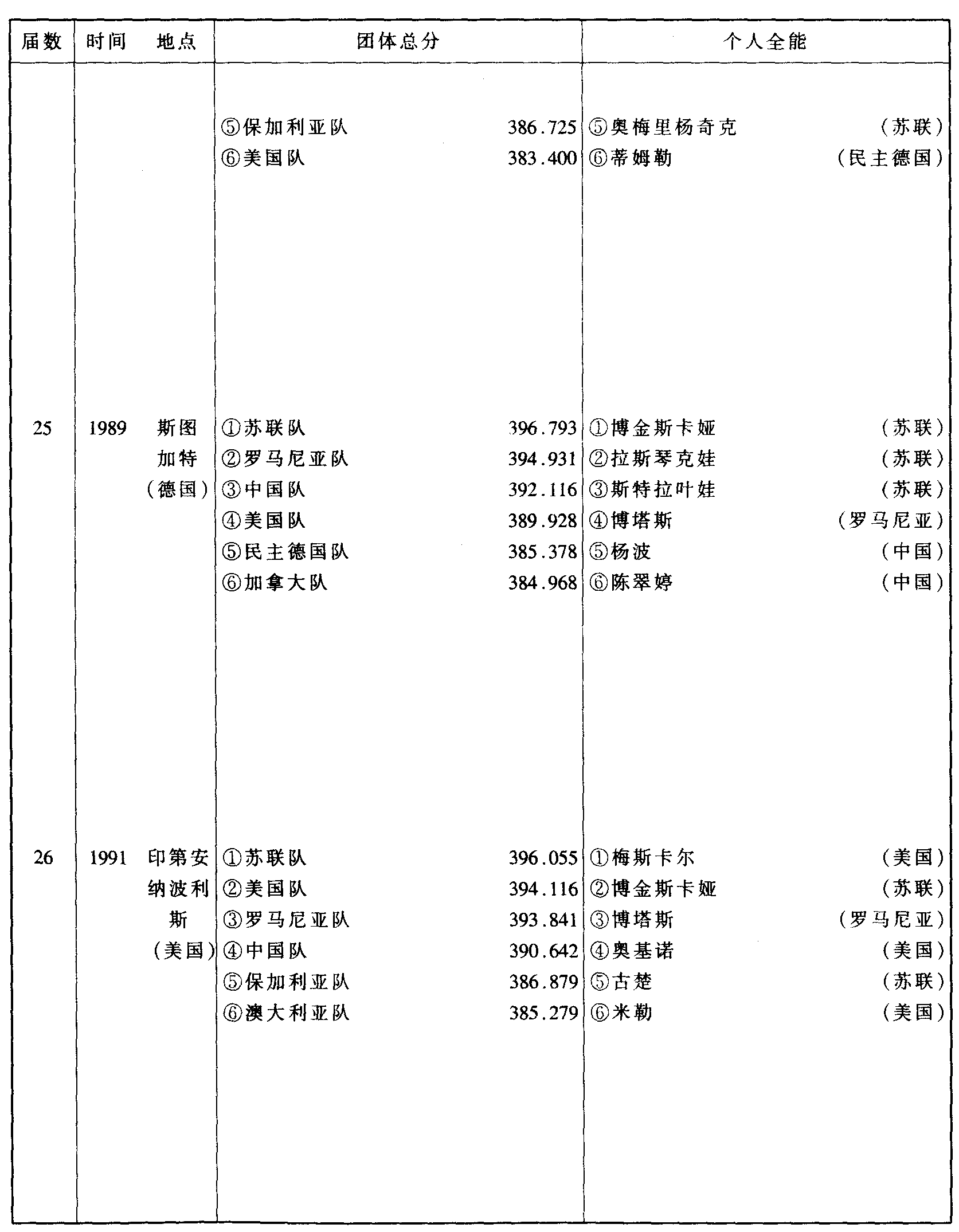 历届世界体操锦标赛比赛成绩
