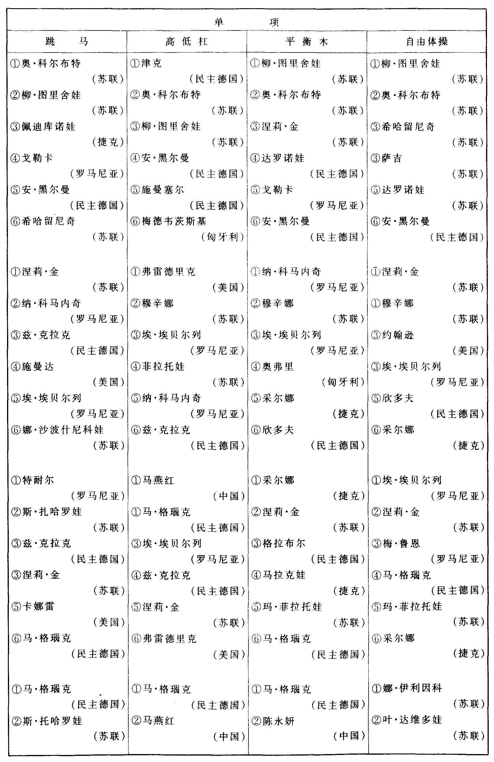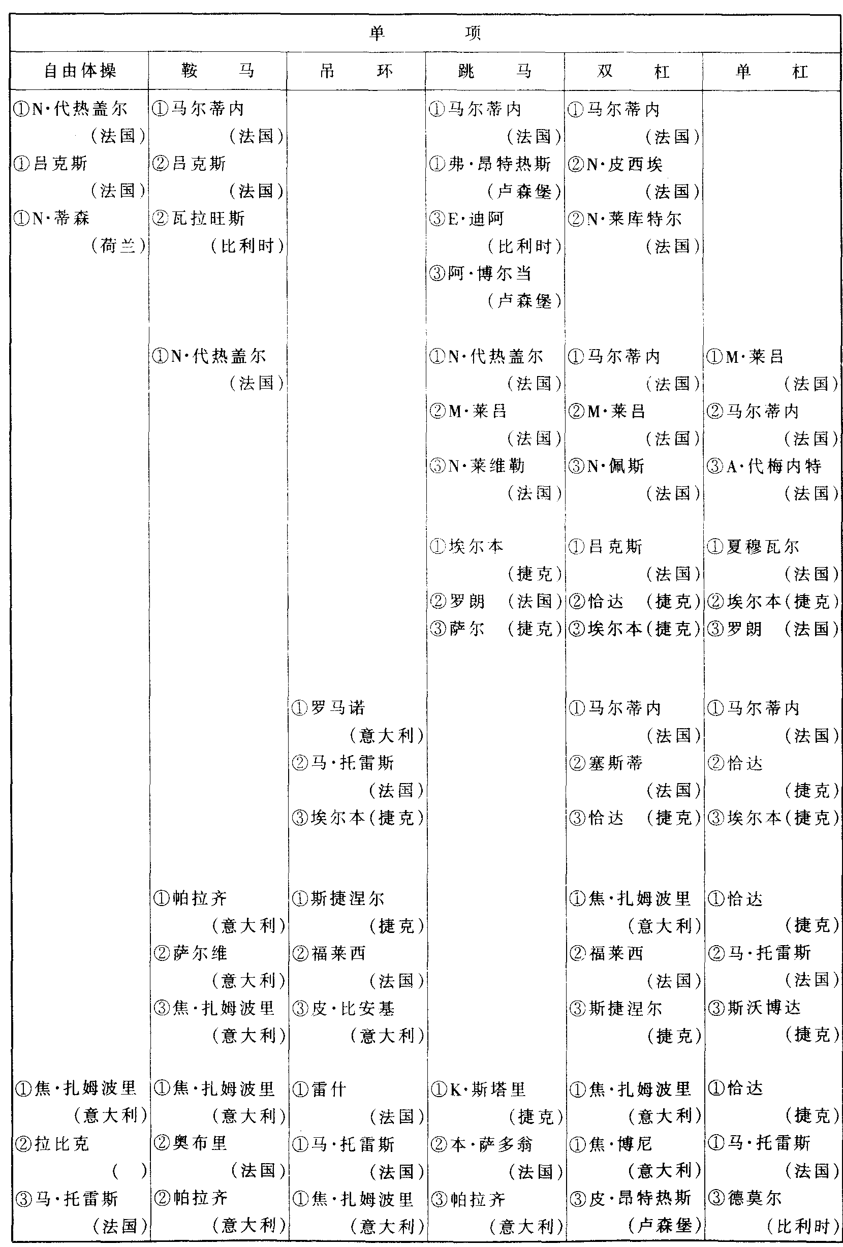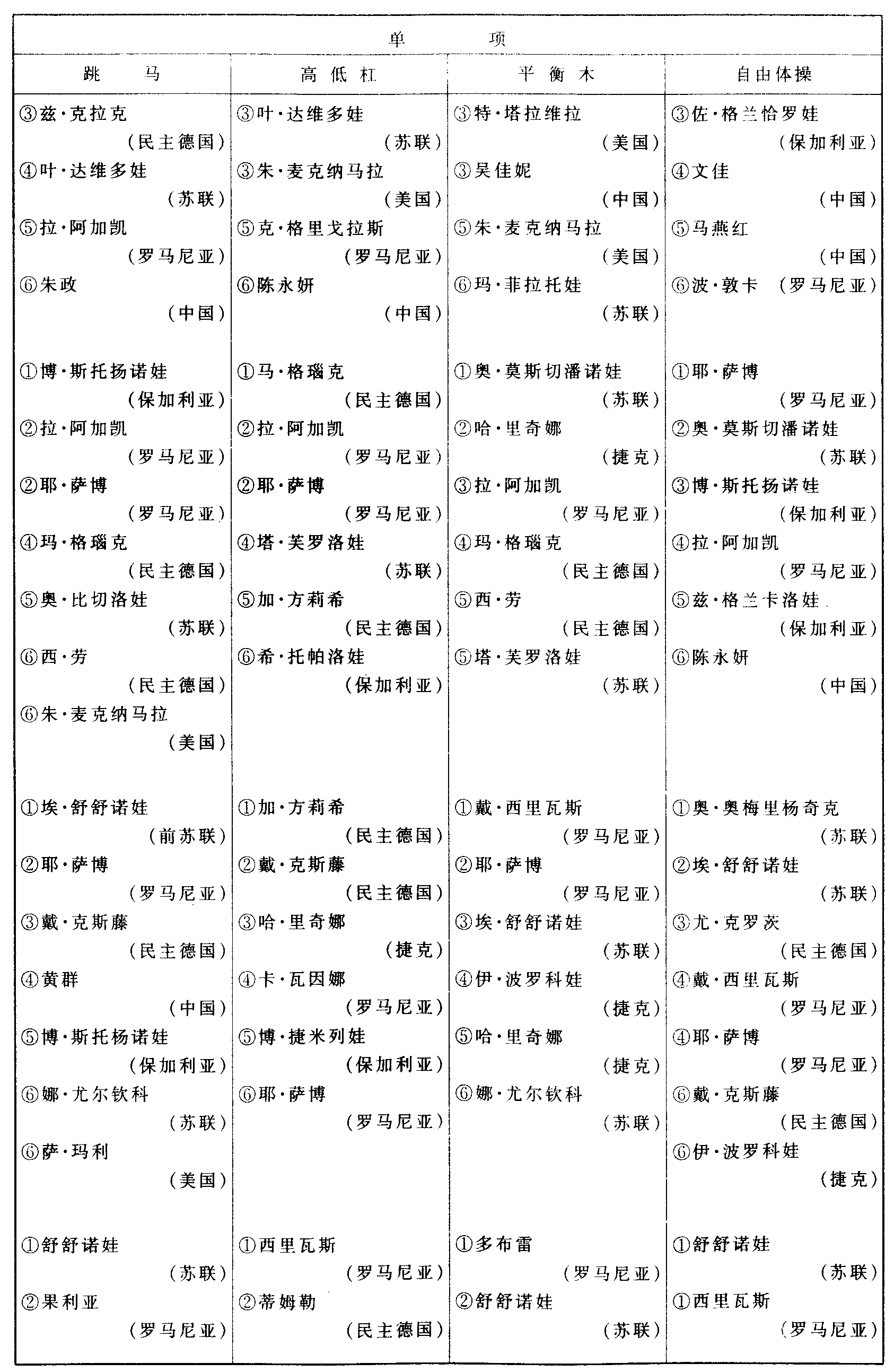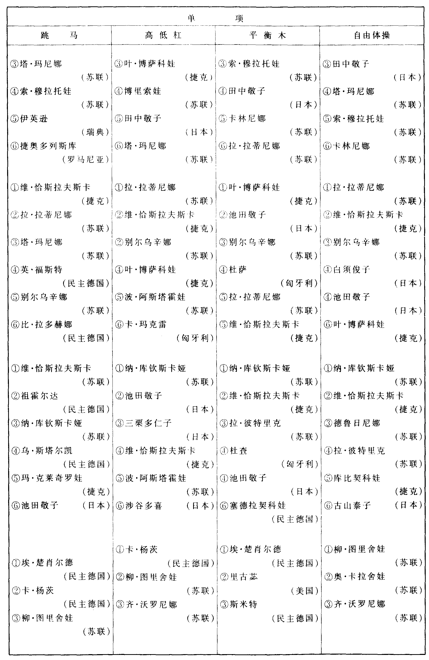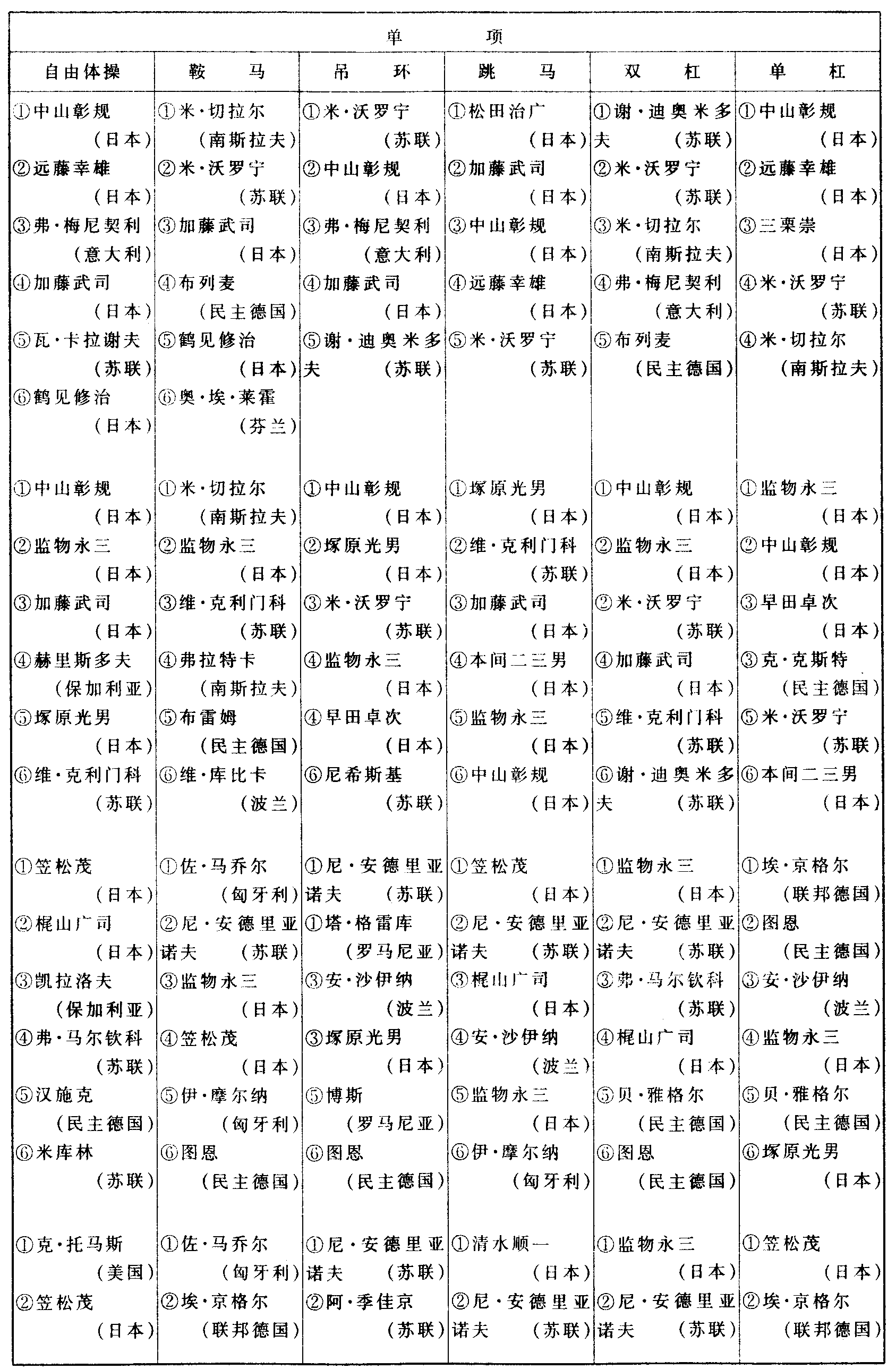 历届世界体操锦标赛比赛成绩