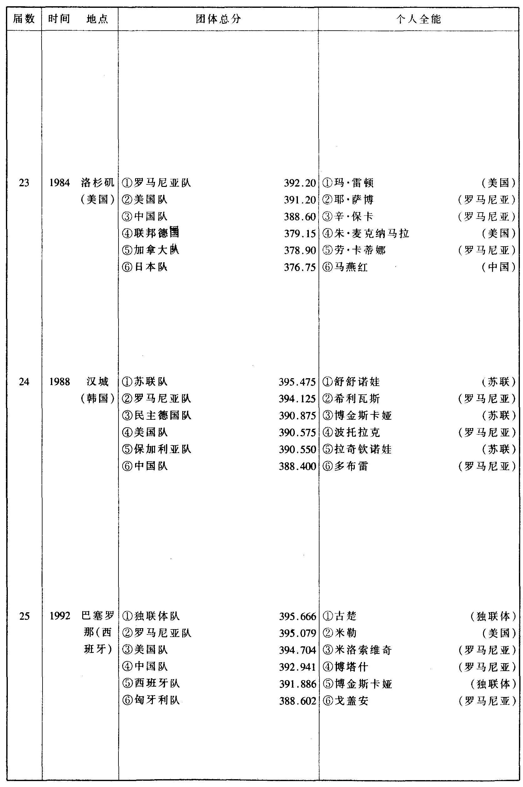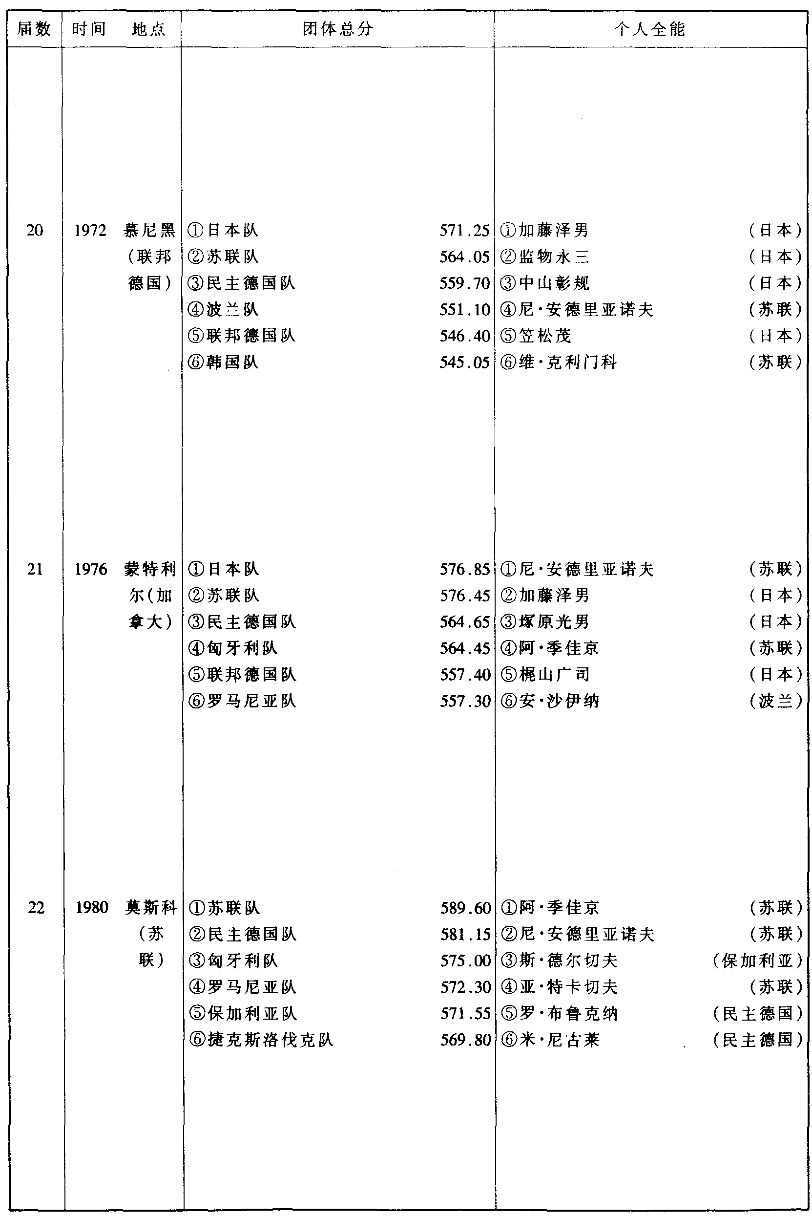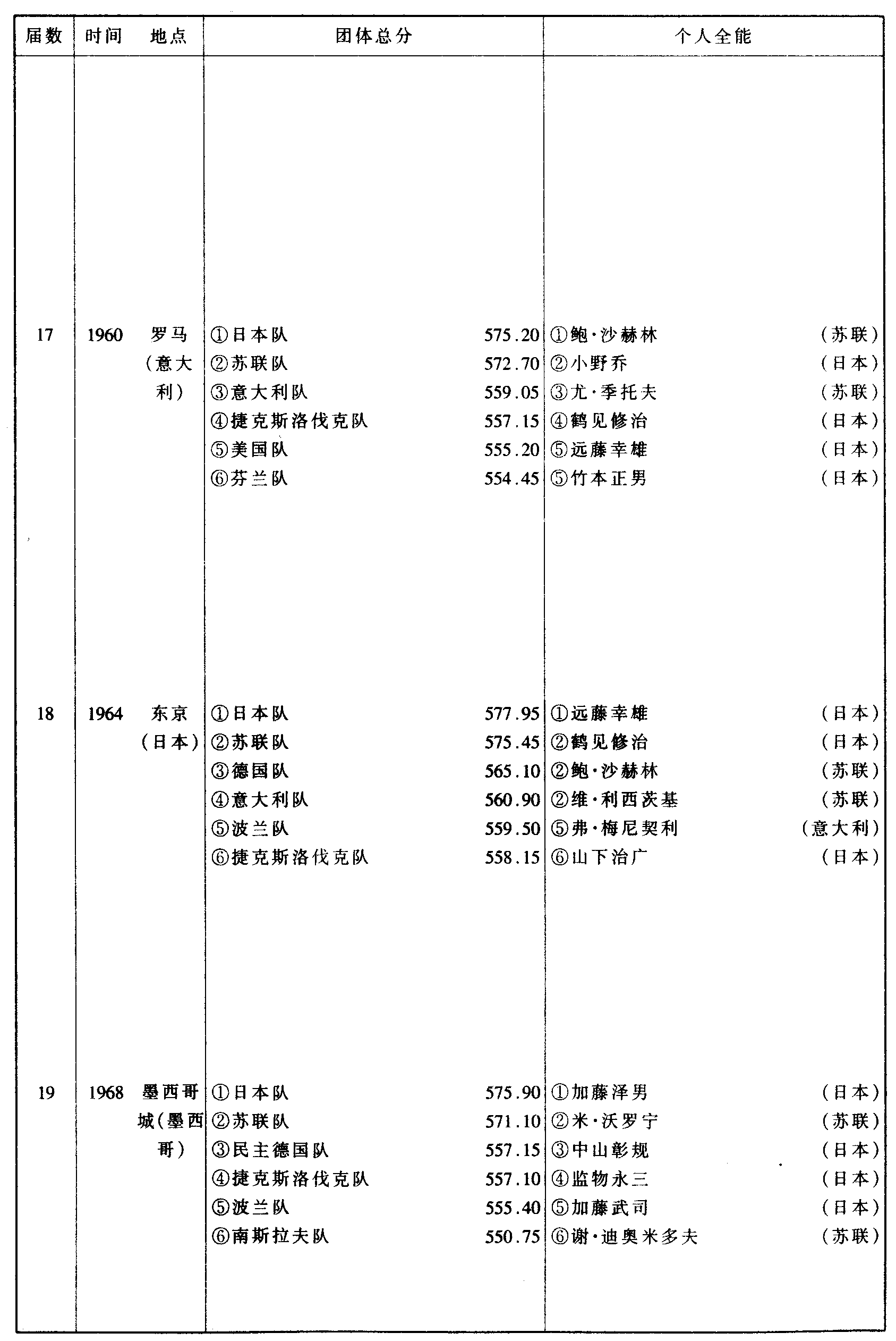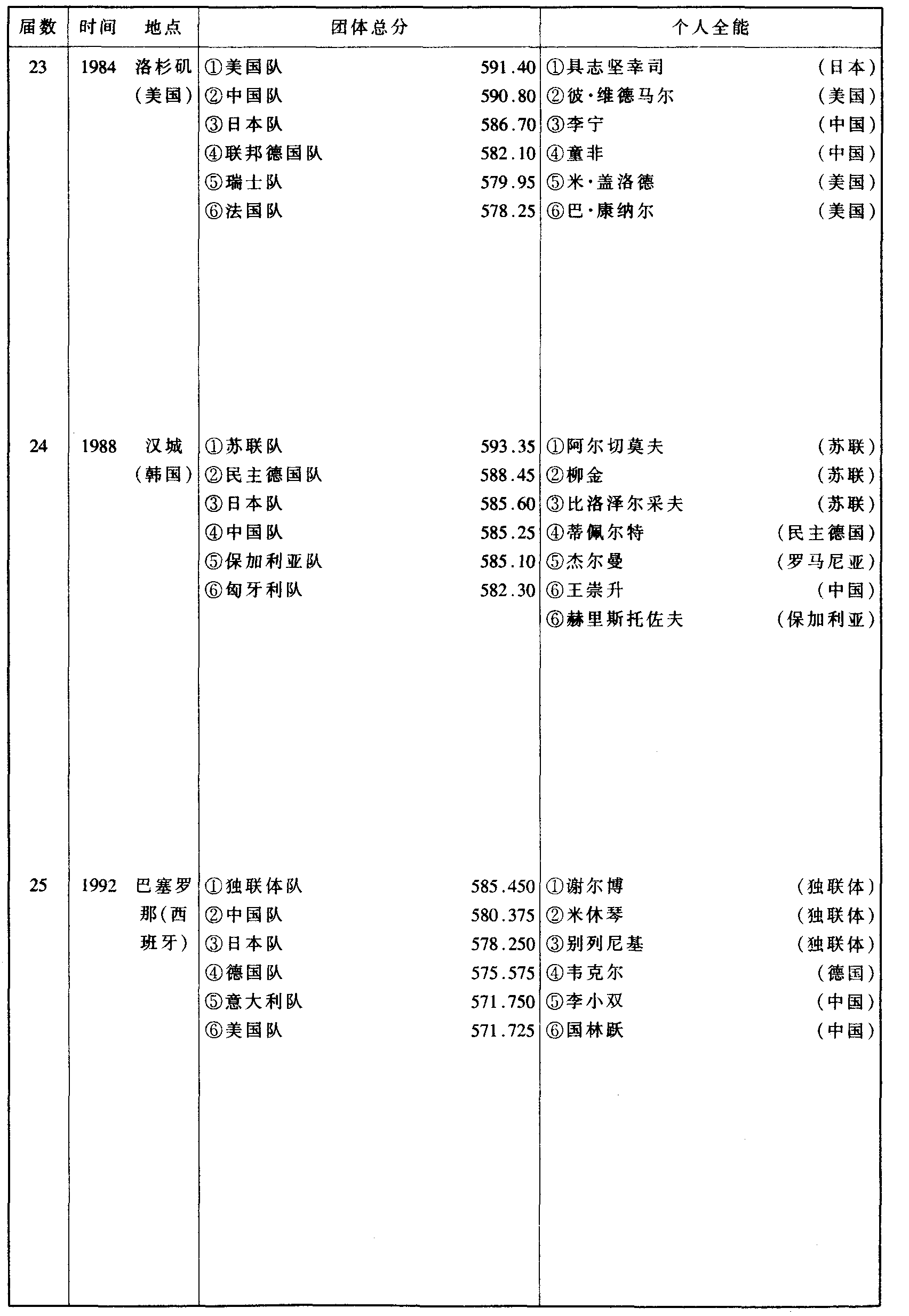 历届奥林匹克运动会体操比赛成绩