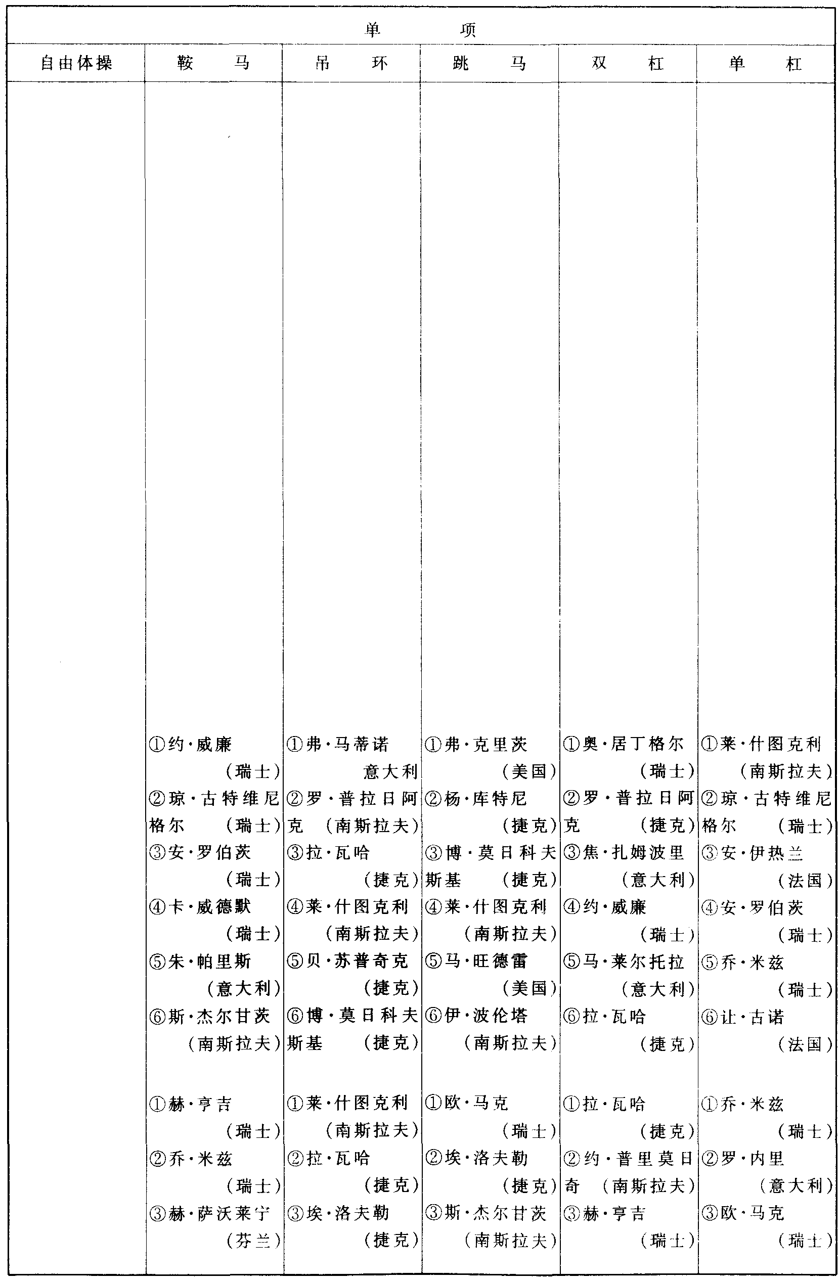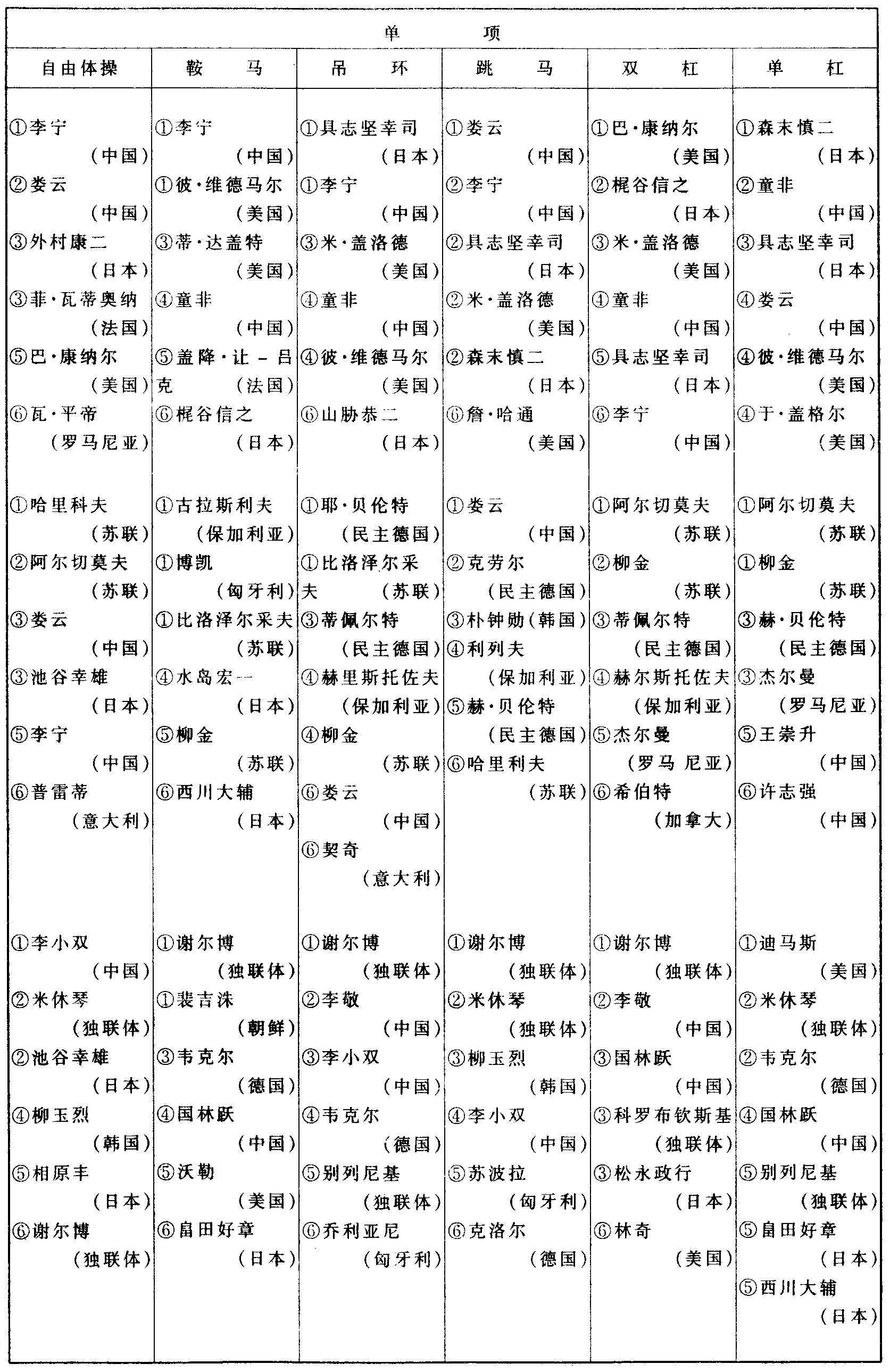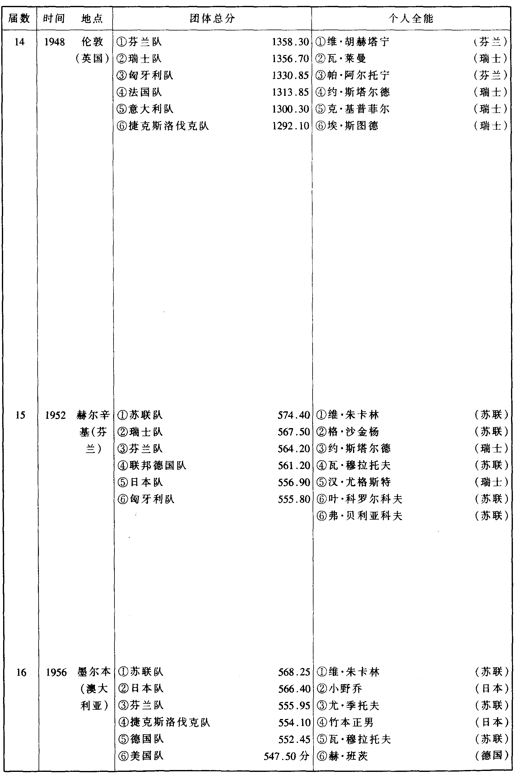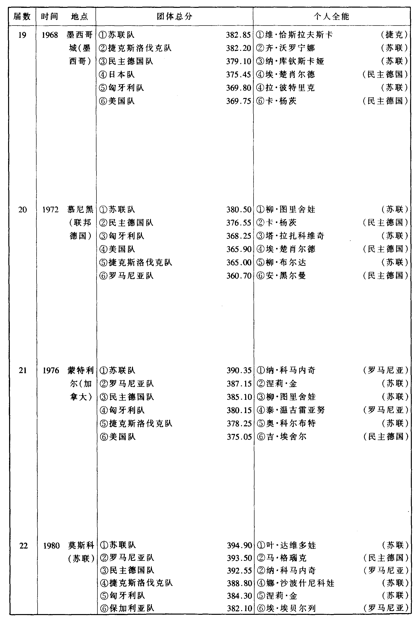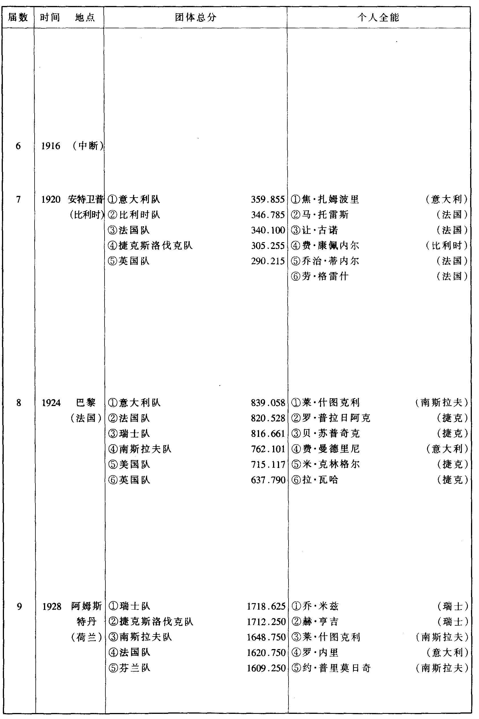 历届奥林匹克运动会体操比赛成绩