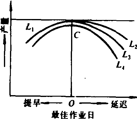谷类作物收获作业违时性损失构成图 评价农业机械化作业的违时损失多用适时性系数K表示。K值是指各种作业每提早或延迟1天,损失部分占其总产值的百分数。例中的8.0618为每延迟1天播种所减少的亩产量,480.5115为最佳作业日期的可能最高产量,二者之比即为适时性损失系数K的