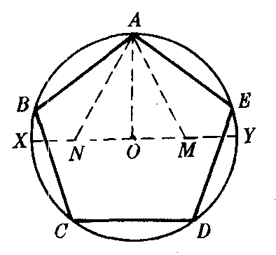 图2 作法二 ❶作⊙O的半径OA⊥直径XY(图2); ❷取OY的中点M; ❸连结MA; ❹以M为圆心,MA为半径作弧交OX于N; ❺连结AN; ❻⊙O上顺次截取等弧,使弦AB=BC=CD=DE=AN; ❼顺次连结A,B,C,D,E.则五边形ABCDE就是所求的圆内接正五边形.