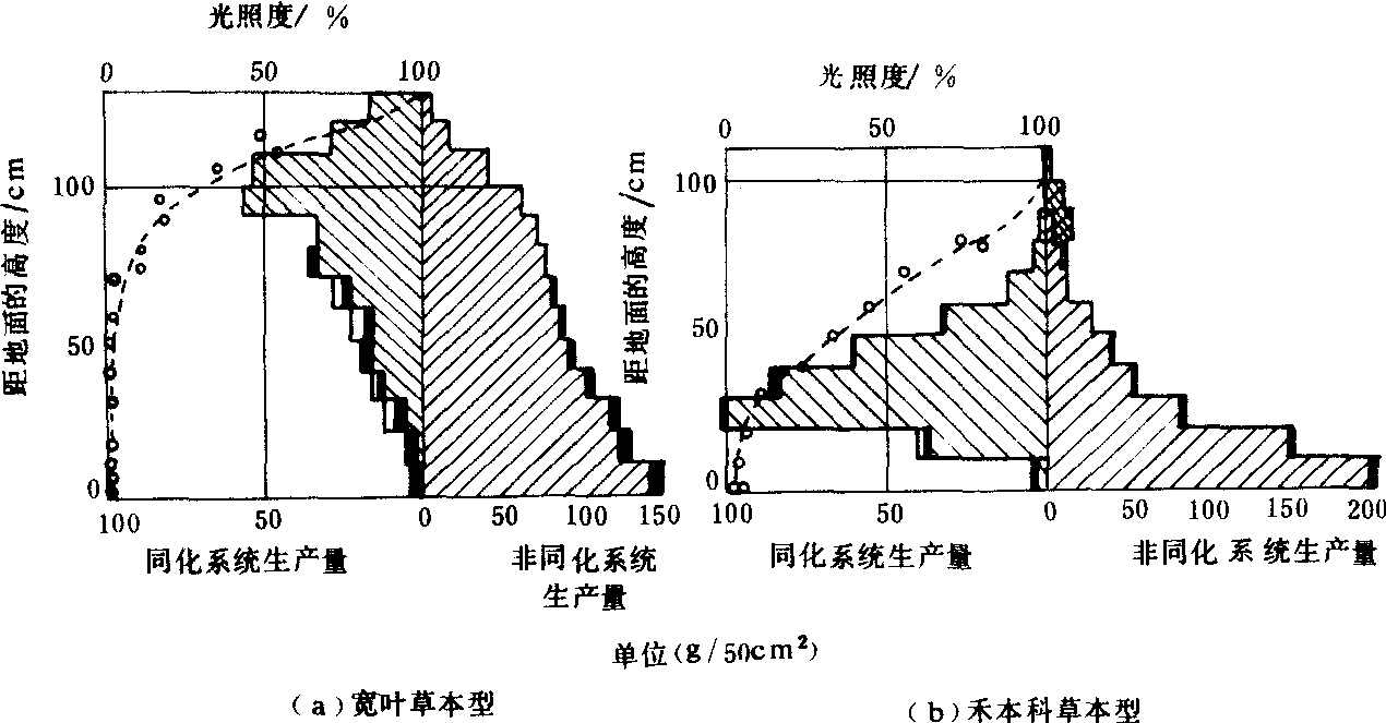 图 1 草地植物群体生产结构类型 作物器官表面积密度函数 主要是叶面积密度函数。它是指高度Z的单位空间体积内所含的叶面积,其单位为厘米-1。为了对不同作物和不同生育期的叶面积进行比较, 也常取相对高度Z=Z/h1(Z为垂直高度, h1为群体高度)代替Z,所得的密度函数, 称为标准叶面积密度函数()。即