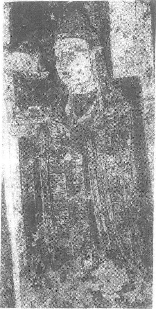 ☚ 维摩诘经变图(天女和听法侍众)壁画 西方净土变图壁画 ☛ 供养比丘图壁画 供养比丘图壁画高昌回鹘(公元9世纪中至公元14世纪)。纵48厘米,横23厘米。新疆维吾尔自治区吉木萨尔县北庭回鹘佛寺遗址南部配殿群103殿大台座东面壁画。比丘是指出家后受过具足戒的男僧,据《大智度论》载,比丘有五个意义:乞士(靠乞食为生)、破烦恼、出家人、净持戒、怖魔。这个比丘像以蓝色为底,头戴红格帽,圆领内衣外套袈裟,袈裟质地轻薄飘垂。比丘的面型线条圆润,五官秀巧而紧凑,神态端庄而温和,双手持盘,盘中盛物。整个形象采用重彩平涂,焦墨勾勒的手法,宗教艺术效果颇为浓郁。此壁画的绘画时间大约在公元10世纪末至13世纪初。