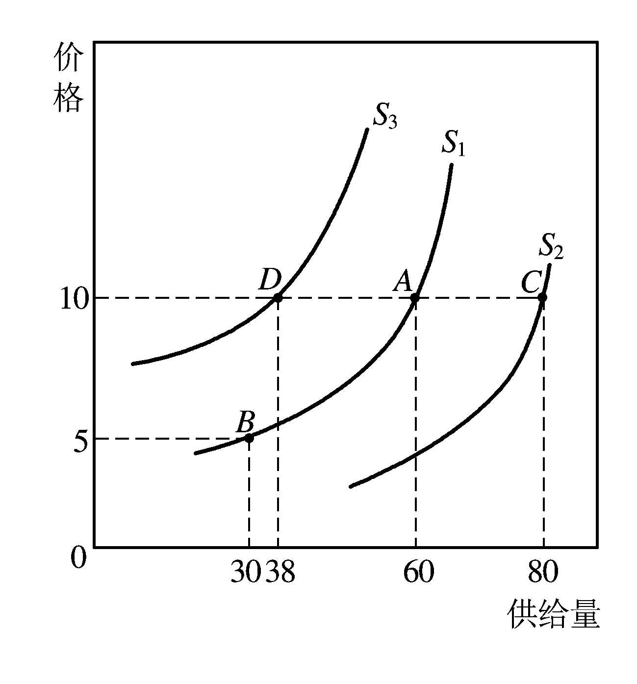 Qs=-a+bP 其中,a,b为常数,且a,b>0。与该函数相对应的供给曲线为一条直线。供给曲线Supply Curve在某种价格水平下整个社会的厂商愿意供给的产品总量。所有厂商愿意供给的产品总量取决于他们在提供这些产品时所得到的价格,以及他们在生产这些产品时所必须支付的劳动与其他生产要素的费用。总供给曲线反映了要素市场(特别是劳动市场)与产品市场的状态。 供给曲线表明商品价格与其供给量之间相互关系的曲线。以纵轴表示商品的价格,横轴表示商品的供给量,供给曲线是一条向右上方倾斜的曲线。它反映了一般的商品供给规律,即在其他条件不变的情况下,若商品价格上升,其供给量就上升;若商品价格下降,其供给量就下降。图中给出三条供给曲线S1,S2,S3。以S1曲线为例,假定在A点,某种商品的价格为10元,其供给量为60;当价格下降到5元时,其供给量下降为30,即从A点变动到B点。当价格不变时,如果有其他因素影响到商品供给量,供给曲线本身将发生移动。如在供给曲线S1的A点,某种商品的价格为10元,其供给量为60;如果价格不变,仍为10元,但因原材料价格下降,使该商品的供给量增加,那么供给曲线将向右移动到S2,这时的供给量上升为80,即在C点;若因原材料价格的上升使该商品的供给量减少,那么供给曲线将向左移动到S3,这时供给量下降为38,即在D点。在同一条供给曲线上各点的变动,说明当影响供给量的其他因素不变时,随着价格的变化,供给量所发生的变动。供给曲线本身的移动,说明在价格不变时,有其他因素影响了商品的供给量:如有其他因素促使商品的供给量上升,则使供给曲线向右移动;如有其他因素促使商品的供给量下降,则使供给曲线向左移动。 .jpg)