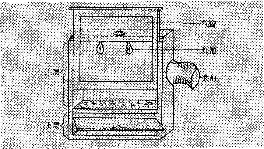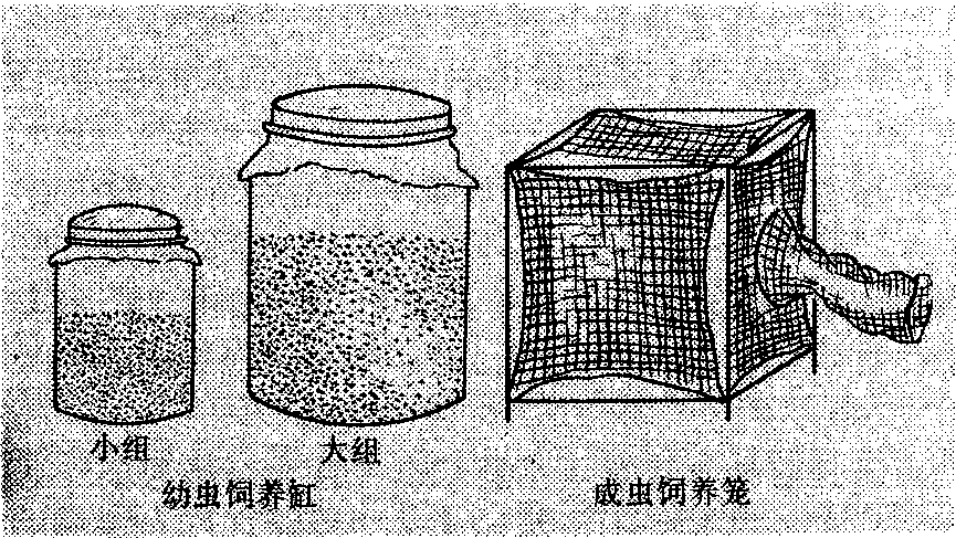 果蝇饲育 果蝇(Drosophila melanogaster Mei-gen)是常用的供试昆虫。其优点是:❶对药剂的反应敏感; ❷繁殖速度快,易于饲养; ❸生活史短(卵期3~4天,幼虫期7~10天); ❹饲养操作简便。一般用广口瓶可在25℃恒温室或温箱中饲养。 常用的饲料配比为琼脂:玉米粉:糖:水为1:7:5:50,和少许酵母粉。配制方法是先用1/3的水将玉米面调成糊状煮成玉米糊,用2/3的水将琼脂加热煮化后同玉米糊均匀混合,再加糖搅和,待温度降至40℃左右时加入酵母。混匀后分装在广口瓶中。每瓶装饲料厚度2~3厘米即可。 果蝇的食物是酵母,而饲料是酵母的培养基,或是果蝇的补充营养。饲料装入瓶后可立即接种果蝇,也可放2~3日待饲料发酵后接种。接种果蝇是利用其趋光性强的特点,先把果蝇移入麻醉瓶,麻醉后移入预先放在饲料上的小纸袋中,让其恢复活动产卵。接种后24小时,将瓶内成虫全部释放,使瓶内的卵都是24小时内产的,以便获得生理情况比较一致的试虫。 粘虫饲育 粘虫(Mythimna separata Walker)生活史较短、繁殖快,能常年饲养,可在恒温室(25℃,相对湿度75~85%)中饲养,也可在恒温箱中饲养。 幼虫饲育 1~4龄幼虫大体上3天长一个龄期,5~6龄虫5~8天长一龄。在1~2龄期食量很小,可2~3天换一次饲料,3龄以后食量增大,需每天换饲料和清理虫粪。在瓶内饲养要特别注意湿度,饲养缸壁上有水珠会淹死刚孵化出来的幼虫,太干时也容易死亡,饲料也易干枯。一般瓶底要铺两层吸水纸。饲养虫量比较大时,可换到大饲养盒中饲养。每盒可养幼虫1000条左右。小龄幼虫也可制作小养虫盒饲养。幼虫饲料以玉米叶较好,小麦、谷子、水稻叶亦可。小龄幼虫的饲料一定要鲜嫩,3龄以后可以用较老的叶饲喂。虫龄大时还要注意幼虫体色,黑色表示密度过大,体表油亮表示湿度过大,应及时加以调节。幼虫老熟后开始停食,虫体缩短发白,可将这样的幼虫移入含有半干半湿(含水量约15~18%)已消过毒的砂土玻璃缸中,缸口蒙上粗白布让其化蛹。蛹期10~14天,羽化时每天清晨将成虫移入纱笼饲喂。 成虫饲育 成虫在纱笼中饲养,饲喂10%蜜糖水。成虫羽化后2~3天开始交配,并在放入笼内的小稻草把上产卵,每天检查一次,将草把上产的卵块剪下放入小玻璃缸中孵化饲养。在25℃、相对湿度80 ~90%下,卵经5天即可孵化。卵将孵化前变为铅灰色,这时便可加嫩玉米叶准备饲喂幼虫。 飞蝗饲育 东亚飞蝗(Locusta migratoria manilen-sis Meyen)体大、易饲养,在昆虫生理毒理研究中是常用试虫。 饲养蝗虫 一般用木制蝗虫饲养箱(图2)。箱分
