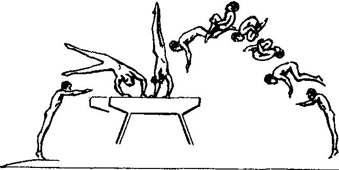 | 释义 | 侧手翻内转90°团身后空翻两周 侧手翻内转90°团身后空翻两周支撑跳跃最高难度动作之一。推手形成的支撑反作用力,通过人体总重心的后方,使上体产生同向转动进入腾空。属手翻空翻复合型动作。运动形态特征是:侧手翻内转90°推离后,人体以团身姿势向后翻转两周。技术要点:起跳后,上体侧转下压,两臂前伸撑向器械,同时腰侧发力带动下肢上摆(边上边转),当接近倒立瞬间,脚面急遽下压,猛力推离。紧接快速向上梗头起肩抬上体,当含胸、圆背进入横轴翻转时,立即屈膝上顶,用力向上翻臀,两臂迅速抱腿加速翻转(抱腿动作应由抱到勒,这样有利于第2周速度加快)。当第2周翻转到人体成俯势后,松手梗头立腰,随即紧髋放腿准备落地。练习者在掌握“塚原空翻”的基础上,可练习弹簧跳板的团身后空翻两周(落点逐步加高)。当空中转速和定向能力提高后,则应将马放置在海绵坑边进行直接练习完整动作。