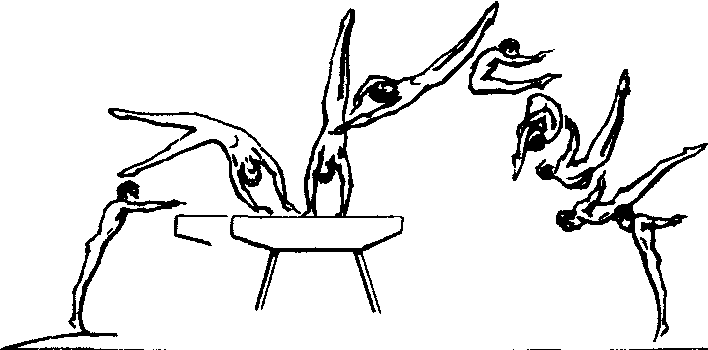 | 释义 | 侧手翻外转90°屈体前空翻转体180° 侧手翻外转90°屈体前空翻转体180°又名“屈体笠松”,支撑跳跃高难度动作之一。推手形成的支撑反作用力,通过人体总重心的后方,使身体产生同向转动进入腾空。属复合多轴型动作。运动形态特征是:侧手翻推离向外转90°向前屈体空翻,同时转体180°。技术要点:起跳后,上体侧转下压,同时两臂前伸,立即腰侧发力,带动下肢上摆,至倒立瞬间,脚面上顶下压,猛力推离。随即左肩后引,头部左转向左转体的同时,积极起肩、立上体,紧接向下梗头、跟肩猛制动(应配合吸腿)。当空中以屈体姿势向前翻转成仰势时,立即脚面带动向前上边伸边转,与此同时,左臂后带向左转头完成转体180°,随即两臂上举,头部上顶,起肩立腰,紧髋伸腿准备落地。当练习者掌握“笠松空翻”的技术后,可将马前放置高垫(与马同高,上层铺海绵包)练习侧手翻外转接屈体前空翻成高垫“仰卧”,然后适当降低落点高度,在助力下练习接屈体前空翻转体180°成高垫“俯卧”。保护者位于马前高垫上,在空中托背搓髋助其翻转,待概念清楚后,可将马放置在海绵坑边直接练习完整动作。