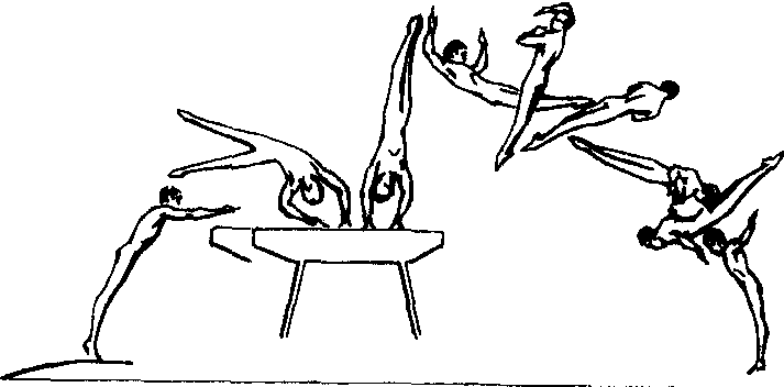 | 释义 | 侧手翻外转90°直体前空翻转体540° 侧手翻外转90°直体前空翻转体540°又称“直体笠松转体360°”。支撑跳跃高难度动作之一。推手形成的支撑反作用力,通过人体总重心的后方,使身体产生同向转动进入腾空,属复合多轴型动作。前苏联运动员马库茨于1979年首先完成。1983年第21届世界体操锦标赛上,前苏联运动员阿卡皮扬用它击败所有对手,摘走了男子跳马世界冠军的桂冠。运动形态特征是:侧手翻推起,做直体前空翻转体(向外)630°。技术要点:起跳后,上体侧转下压,两臂前伸,腰侧发力带动下肢上摆,到上至倒立瞬间,下肢侧伸下压,猛烈推离,随即迅速立腰起肩抬上体,右臂向前下猛带至胸前抱紧,梗头含胸、兜髋紧腰、绷紧整个身体进入多轴旋转的空间运动。此时应注意向两侧伸臂动作要稍晚一些,当面部将转向器械的瞬间,起肩立腰,接着向两侧伸臂,随后挺胸紧髋准备落地。通常当练习者熟练地掌握侧手翻外转接直体前空翻转体180°和弹簧跳板直体前空翻转体720°等动作的技术后,可将马放置在海绵坑边进行直接练习。