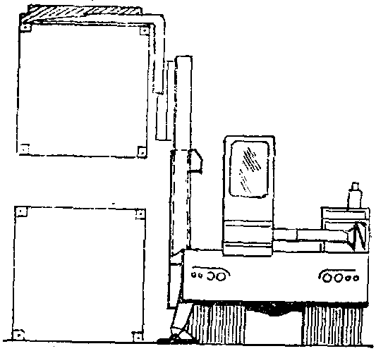 | 释义 | 侧面集装箱叉车 侧面集装箱叉车货叉装置位于车体侧面的集装箱叉车。它可将门架和货叉从侧面移出,叉取集装箱后收回,将集装箱放置在货台上进行搬运。与正面集装箱叉车比较,其载箱行走时的横向尺寸要小得多,因而要求的通道宽度也小;且此时的负荷中心位在前后车轮之间,故行走稳定性较好,轮压分配也较均匀。但其结构和操作较复杂,装载视线差,装卸效率也较低。一般适用在集装箱吞吐量不大的普通综合性码头和堆场上进行作业。如下页图示。