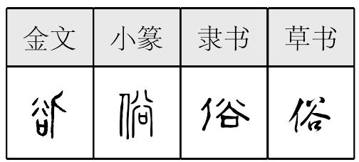 *俗sú9画 人部 (1) 社会风气、习惯: 民~|随~|移风易~|约定~成。 (2) 大众的;通行的: ~话|~文学|~体字。 (3) 平庸;一般: ~众|~务|出言不~|表现不~。 (4) 粗鄙;不高雅: ~气|~套|庸~|这身打扮太~。 (5) 佛教徒称尘世间或没有出家的人: ~缘|~家|僧~|还~。 俗 ☚ 儉 俾 ☛ 俗sú西周中期以来的形声字。从亻(人),谷声。音变如谷欲浴裕峪例。是欲的本字。想要,希望义。是人的想念,所以从人。欠是从人张口,有欲望、义更显。后来小篆从欠作欲,与俗分化。《说文》说俗义指风俗,习惯。如:移风易俗。俗义已转。引申为大众化的,最通行的,习见的。如:俗语。组词如:通俗。转义为贬义,指趣味不高的,令人讨厌的。如:这画太俗。组词如:庸俗。 俗★常◎常