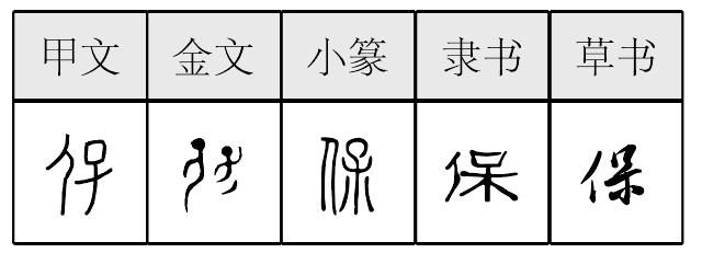 ❹晚节不保|自身难保 保保,甲骨文作   ,金文作           ,《説文》古文作 ,小篆作 。 甲骨文从子从人,且多置 “子” 於 “人” 的背後,早期金文更顯示爲大人環臂伸手負子於背的意象,故知字形以大人背負小兒會意,本義是保育。金文第六字形是常見字形,與甲骨文第四字形即西周字形相同,“子” 旁一短撇或本爲早期手形遺迹,或本是區别符號。後爲求對稱而增一短撇。末字戰國金文增 “爪”爲意符,或以爲是从人,孚聲,即以 “爪” “子” 合成 “孚”而聲化。金文字形中有增 “玉” 爲意符者當是 “寶” 字,銘文“保” “寶” 或通用。“保”在卜辭中或用護佑義。銘文用保佑、保持、保衛等義。或用爲官名,即太保。或通 “胞” “抱”。又孳乳爲“褓”“媬”等字。 楚簡帛文作 ,篆勢猶存。秦簡牘文作 ,古隸典型。 保bǎo会意字,甲骨文像人反手抱着一个小孩,小篆与楷书左边为“人”,右边的“子”加了两点,像是下肢,本义为照料小孩,“保育院”即用其本义,作声符生成的字有: bao 阴平:煲(电饭煲) 褒(褒奖) 襃(同“褒”) 上声:葆(永葆青春) 堡(堡垒;另读bǔ、pù作地名,瓦窑堡) 褓(襁褓) bǔ 堡(瓦窑堡) 保bǎo(9画)