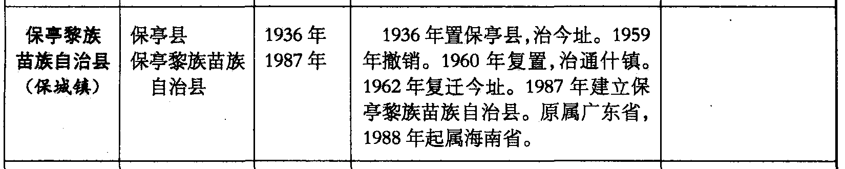 保亭黎族苗族自治县(保城镇)保亭县保亭黎族苗族自治县1936年1987年1936年置保亭县,治今址。1959年撤销。1960年复置,治通什镇。1962年复迁今址。1987年建立保亭黎族苗族自治县。原属广东省,1988年起属海南省。