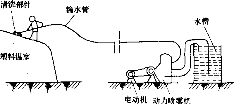 图 3 塑料棚膜清洗机及作业示意图 柄,利用动力喷雾机喷射出来的15~20公斤/平方厘米的高压水作为动力,从喷嘴喷出,冲击水轮机叶片,使水轮部件高速旋转并带动毛刷,清洗塑料棚膜(图3),以提高透光度。也可清洗玻璃屋面。每小时可洗净150~300平方米面积,每分钟需水量6~8升。 |