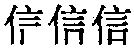 * 信xìn9画 人部 (1) 诚实;确实: ~史|~守|~而有征。 (2) 相信,认为可靠而不怀疑;信奉: ~仰|~任|~条|~徒|这件事我不~。 (3) 信用,能够履行跟人约定的事情而取得信任: ~誉|失~|守~。 (4) 随便;随意;放任;听凭: ~口开河|~马由缰。 (5) 凭据: ~物|~号|印~。 (6) 书信;按格式写给他人看的文字: 书~|证明~|给同学写封~。 (7) (~儿)消息: 音~|捎个~儿。 (8) 引信,引爆爆炸物的导火装置: ~管。 (9) 信石,即砒霜: 红~|白~。 (10) 同“芯(xìn)”。