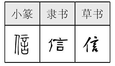 xìn表意,从人从言(一说形声,从言,人声),言语是心声的流露,故本义表示言语真实,诚实而有信用,引申为信任、相信、信奉(宗教)、凭据、消息、书信或文书、听凭、随意等。 【辨析】 ❶信/书 在上古,书信叫书,不叫信。“信”本来指言语真实,到了南北朝时期才有了书信的意思。 ❷信/讯 用于书信、音讯义,“信”和“讯”是同义词。 ❸信/诚 见46页“诚”。信 (xìn) 从人、言。 【按】《説文解字注》釋“信”曰:“誠也。《釋詁》:誠,信也。”同意互訓,“信”講人言而有信。