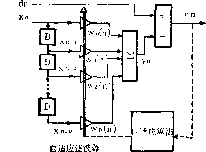 图1 一种自适应处理系统方框图 自适应处理在抑制高频电刀对心电监护的干扰中的应用,如图2所示。外科手术刀是利用高频电流工作的,因而会严重干扰心电监护中的心电图记录,对此可采用如图2(a)所示的自适应噪声抵消法。输入d(t)取自一般