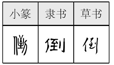 另见:走向 各方1 目标 辨认 各面看清2 ☚ 方向 各种方向 ☛ 倒dǎo;dào(一) 都皓切,上皓。 ❶仆倒;跌倒。《史记·司马相如传》:“弓不虚发,应声而~。” ❷压倒,倾服。杜甫《上韦左相》:“聪明过管辂,尺牍~陈遵。” ❸见“老倒”。 (二) 都导切,去号。 ❶颠倒,倒置。《楚辞·九章·怀沙》:“变白以为黑兮,~上以为下。” ❷倾出,倒出。《文心雕龙·夸饰》:“~海探珠,倾崑取琰。” ❸违逆;违背。《韩非子·难四》:“~义则事之所以败也;逆德则怨之所以聚也。” 〖倒〗 (一)粵 dou2〔島〕普 dǎo ❶ 向前跌倒,豎直的事物倒卧在地。許慎《說文解字》:「〜,仆也。」(仆【粵 fu6〔附〕/ puk1〔篇幅切〕普 pū】:向前跌倒。)紀昀《閱微草堂筆記.河中石獸》:「石必〜擲坎穴中。」(〜擲:傾倒。坎【粵ham2〔砍〕普 kǎn】穴:洞坑。) ❷失敗,垮台。裴松之《三國志.魏書.曹爽傳.注》:「於今日卿等門戶〜矣!」