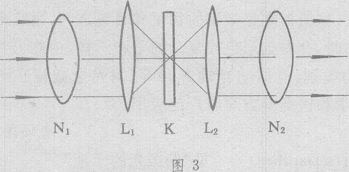 图 3 会聚偏振光干涉的装置如图3所示。K为光轴垂直于表面的晶片。透镜L1将平面偏振光变为会聚偏振光,射到晶片上,透镜L2则将从晶片出射的光,再变为平行光。干涉图样呈现在N2之后的屏幕上,以相同入射角入射到晶片的光线交于屏幕上同一半径的圆周。光线在晶片内分解成o光和e光,从晶片出射时两束光之间有位相差,而位相差与入射角有关。因而干涉条纹为明暗相间的同心圆环。若用白光入射,可看到彩色的同心环,同一圆周为同一色,所以称这种干涉条纹为等色线。图4为会聚光干涉的干涉图样,图中除明暗相间的圆环——等色线外,还有黑十字刷。若光线在N1的透振方向和K的光轴构成的平面内,或在过光轴目与上述平面垂直的平面内,那么从N1出射的线偏振光,它的光振动方向沿着N1的透振方向,相当于晶片内的e光或o光,从晶片出射时,仍为原振动方向的线偏振光。当N2与N1正交时,这些光线不能通过N2,这就是黑十字刷出现的原因。当N2与N1平行时,将呈现亮十字刷。如果晶体的光轴为其它取向,所得的干涉图样将十分复杂。