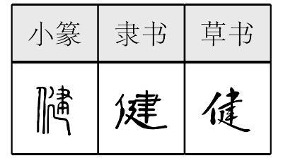 【提示】聿中的 , 当中有竖笔穿过,中间一横与横折相交、右边出头,不要错写成相接、右边不出头的 。 廴, 不要错写成辶。 *健jiàn10画 人部 (1) 强壮有力: ~康|~美|~儿|强~。 (2) 使强壮有力: ~胃|~身。 (3) 在某方面突出;善于: ~忘|~谈。 健 ☚ 僤 傲 ☛ 健jiàn古代形声字。从亻(人),建声。强壮有力义。现代主要指强壮,身体好。如:健儿。组词如:健康|强健|保健|健全。引申指善于,对于某种事情精力旺盛。如:健步|健谈|健饭|健忘(容易忘)。 健★常◎常