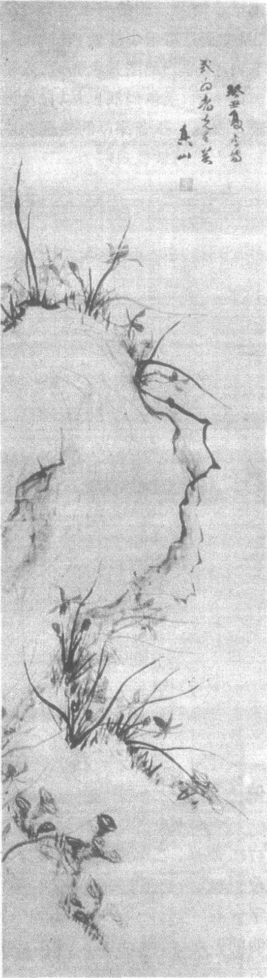 清。傅山绘。绫本水墨。纵166厘米,横47.5厘米。江苏省南京市博物馆藏。傅山(公元1605—1684年),字青主,号公之佗,山西太原人。明朝灭亡后,受道法,服道装。金石收藏甚丰,书法的造诣很高,著有《霜红龛集》。善画山水、竹石,极富自然情趣。此图选取山间谷地一角,浑圆舒缓的坡地上,丛丛墨兰横卧斜生,风致飘扬,仿佛传来缕缕清香。几枝灵芝圆厚肥嫩,墨兰与灵芝疏密相间。笔路沉着,用墨富于层次,浓淡相宜,对岩石略加披麻皴染,整个画面具有超然出世的含蓄意境。款署癸丑(公元1673年)。