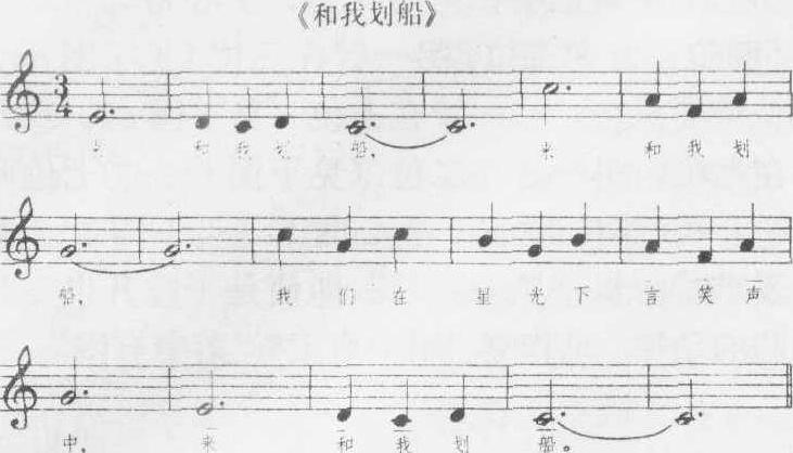 ❷节奏律动课例: 场景设计: 一群孩子在月光下划着小船,手拿吉它,边划边唱。 动作说明: ❶手做抱琴状,身体随乐曲节奏3拍向左,3拍向右。 ❷头向左倾斜,手做抱琴状,左手不动手掌张开手心向上,右手按3拍子的强弱规律 (强弱弱)击打左手。1~7小节做动作❶;8~11小节做动作 ❷,12~14小节做动作❶。