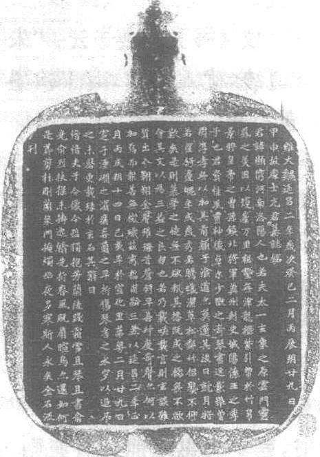 北魏延昌二年(公元513年)。长71.5厘米,宽50.3厘米,高38厘米。1918年河南省洛阳市北朝墓出土。江苏省南京博物院藏。墓志为龟形,有盖,盖题“魏故处士元君墓志”八字。楷书志文19行,刻于龟背甲上,起首为“维大魏延昌二年岁次癸巳二月丙辰朔廿九日甲申故处士元君墓志铭”。此志石造形生动有趣,笔法清晰工整,颇受各家重视,但亦有人疑为伪作。《芒洛冢墓遗文》、《九钟精舍金石跋尾乙编》、《汉魏南北朝墓志集释》均有此志石著录。
