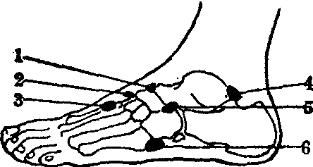 1. 副距舟骨(Pirio) 2.楔间骨 3.跖间骨 4.跗三角骨 5. 第二跟骨 6. 第五跖骨粗隆