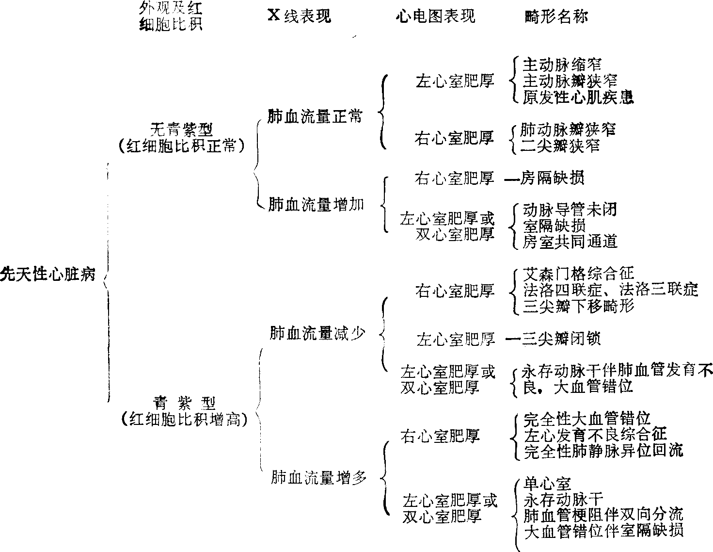 分类 先天性心脏病根据临床表现、病理生理及解剖特点大致分类(见表)。 诊断 (1)病史:应询问家族史,母妊娠早期(特别2~3个月)有无病毒感染史(如风疹、柯萨奇病毒感染及腮腺炎等)、外伤、X线接触或服用致畸形药物史。询问出生后何时出现青紫或充血性心力衰竭,是否有生长迟缓、喂养困难、多汗、气促、疲劳及反复呼吸道感染史等。 (2) 体格检查:注意安静或啼哭时有无青紫、有无畸形外貌(如21-三体综合征),有无其他遗传性疾病的特征,上下肢青紫程度是否一致。注意呼吸情况:过度呼吸表现(呼吸快而深)提示有肺动脉血流梗阻等严重缺氧可能,常见于完全性大血管错位; 呼吸浅而快常见于肺循环负荷增加(左向右分流型)、肺静脉或左心梗阻的先天性心脏病。 心脏检查应注意心率快慢,新生儿与婴幼儿心率大于200次/分为心动过速,小于60次/分疑传导阻滞。注意心脏大小,如出生时大小正常数天后迅速增大,多见于完全性大血管错位、肺动脉闭锁及严重的肺动脉狭窄。任何心脏缺损当并发心力衰竭时,心脏均有不同程度的扩大。 注意心音位置及强弱,生后12小时出现 ❶单一第二音提示血流从单一大血管搏出,可能是肺动脉闭锁或左心发育不良综合征、永存动脉干、三尖瓣闭锁等。 ❷第二音呈宽分裂,提示心房有容量负荷过重现象,见于完全性肺静脉异位回流或大型房隔缺损。 ❸明显第三心音、四心音提示三尖瓣下移畸形。杂音于新生儿期无特殊意义;但杂音粗、长,且伴有震颤,多为器质性,杂音短促则尚须继续观察。有些正常婴幼儿常于左侧第二肋间隙闻及连续性静脉血流声,于俯卧或用手压迫后可消失,以与动脉导管未闭鉴别。年长儿于肺动脉瓣、三尖瓣及二尖瓣区也可闻及收缩期杂音,特点是音调柔和,Ⅱ级以下,不伴震颤,不传导、随体位改变而变化,多为功能性。 周围动脉搏动强烈,提示动静脉瘘如动脉导管未闭、永存动脉干、主-肺动脉隔缺损、常伴有股动脉枪击声,水冲脉。四肢脉搏搏动微弱可能为左心发育不良综合征、严重主动脉狭窄、急性心肌炎。血压及血管搏动,上肢强而下肢弱者(下肢血压较上肢低20mmHg以上)考虑主动脉缩窄可能。 (3) 实验室检查: X线检查: ❶观察肺门及肺野的肺血管影:增多时提示有左向右分流,减少时提示右室流出道有梗阻,但于新生儿期较难确定。 ❷心脏位置: 右位心者注意是否伴内脏反位。1岁以内心胸比例正常在55%以内,超过则示心脏扩大,但应排除正常婴儿胸腺阴影。 ❸观察主动脉位置与气管毗邻关系及肺动脉总干的情况: 肺动脉段凹陷见于漏斗部狭窄或肺动脉总干狭窄,但伴血管易位者可不见肺动脉段。肺动脉段突出提示肺动脉总干扩大,见于左向右分流、肺动脉高压或肺动脉瓣狭窄 (狭窄后扩张)等疾患。左心缘上部垂直提示左侧升主动脉向前,多见于纠正型大血管错位; 左房扩大者常使左总支气管移位,多见于左向右分流型。有时需作吞钡检查协助确定心房是否扩大、主动脉有无缩窄以及有无血管环与异常大动脉等。 心电图检查: 可了解左向右分流型的血液动力学和肺动脉瓣狭窄的严重程度,系统性心电图观察可协助了解病情进展和决定手术时机。P-R间期延长提示心内膜垫缺损或三尖瓣下移畸形可能; 右束枝传导阻滞伴电轴右偏提示房隔继发孔缺损; 右束枝传导阻滞伴电轴左偏可能为房隔原发孔缺损。电轴极度右偏提示大型室隔缺损或右心室双出口。青紫型中右心房大而不伴右心室肥厚者,可能为三尖瓣闭锁或肺动脉闭锁。临床似艾森门格综合征而心电图缺乏右心室肥厚图形者,提示单心室伴大血管错位。有深Q波但缺乏心室肥厚图形者提示梗阻型心肌病或冠状动脉起源异常。 心导管检查及心血管造影检查: 对诊断先天性心脏病和大血管疾病及估计病情均很重要。检查时将不透X线的塑料导管插入静脉或动脉,通过导管的异常走向了解心脏解剖畸形。测各心腔及血管的压力可了解血液动力学变化及有无肺动脉高压。测各心腔、血管内的血氧含量可了解有无分流及分流的部位、大小及心排血量等。心内插管检查不能明确诊断时可进一步作选择性心血管造影检查。近年有采用特殊的体位(头胸抬高20°,右侧抬高10~15°,左肩向后的位置)拍摄造影图像,不仅能显示病变的解剖位置与严重程度,尚可清楚显示室隔缺损大小、畸形是单一或多发以及心室流出道及周围肺动脉发育情况。对根治术的术前准备及安排手术计划均起决定性作用,手术前后对比亦可评价手术效果。此项检查不仅对正常新生儿,对极低体重儿也可进行。心血管造影术的并发症发生率及手术危险性均较单纯心内插管术高,年龄愈小手术死亡率愈高。 超声心动图检查:为非侵入性检查方法之一。此项检查结合M型超声心动图与切面超声心动图对某些先天性心脏病诊断很有价值,可测定各房室大小与心壁的厚度;观察心脏与大血管搏动情况; 室隔活动的方向,从而推测心脏负荷情况。尚可了解心脏各瓣膜的活动规律,通过滑动探头可观察心脏结构的连续性,确定有无畸形存在,如法洛四联症由于主动脉根部右移,超声心动图显示主动脉前壁与室隔连续中断、主动脉有骑跨现象。近年还开展超声声学造影检查以观察有无分流及分流水平。即从周围静脉注入声学造影剂如葡萄糖、过氧化氢、二氧化碳等以产生许多微小气泡,于超声心动图像