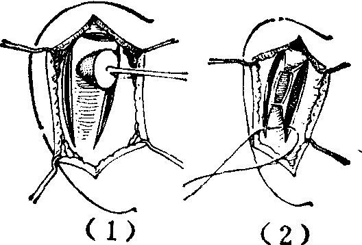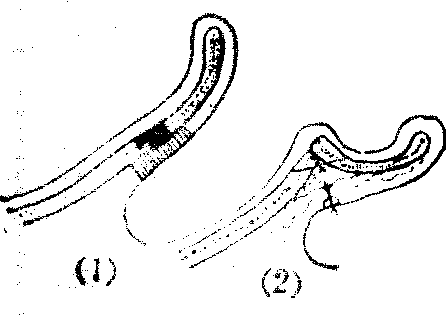 图5 软骨褥式缝合法 (4) 软骨管法。沿对耳轮及其后脚的后缘,后脚的前缘,和后脚的上缘,作互不连接的三条软骨穿透性切口,但保持前侧软骨膜的完整。然后缝合成不完全的管状。如软骨较厚,可从后侧将局部软骨以钢丝刷磨薄,或用刀片削薄,以易于卷拢(图6)。