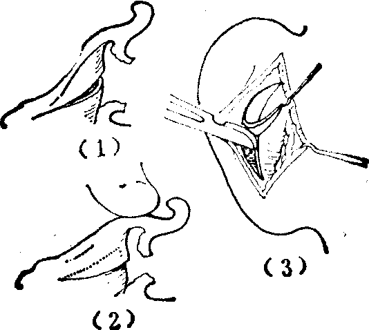 图2 对耳轮及其后脚位置的测定 形成对耳轮及其后脚,有以下几种具有代表性的手术方法。均经耳廓后面的切口,进行广泛的皮下剥离,以充分显露耳廓软骨的后侧面。 (1) 软骨条切除缝合法。经耳廓软骨后壁沿对耳轮及其后脚走行位置,切除一窄条软骨,然后将两侧软骨缘向前翻转缝合,使突出呈嵴状。此法虽较为简单易行,但所形成的对耳轮较锐利,而非正常的圆钝形状,故不甚满意(图3)。