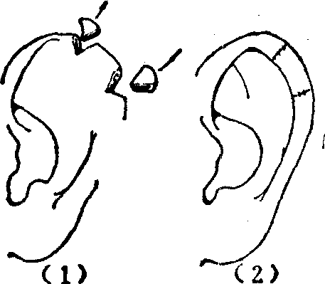 图1 贝壳状耳 治疗除需依照招风耳的手术修复原则形成对耳轮及其后脚外,还需设法构成卷曲的耳轮。于耳廓的游离缘切除几个小的三角形全厚组织块后直接缝合。由于耳廓外缘的缩短收紧,即可出现耳轮的卷曲形态(图2)。