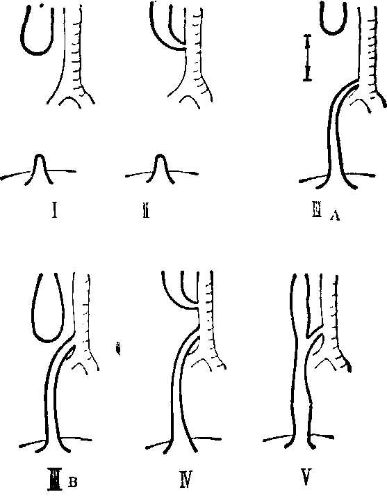 | 释义 | 先天性食管闭锁及气管食管瘘 先天性食管闭锁及气管食管瘘先天性食管闭锁及气管食管瘘是胚胎第3~6周前肠演化成气管与食管时所发生的畸形。起初,前肠腹侧壁外突,在管腔内形成纵沟,称喉气管沟。此沟两边缘从尾端向头端连接而成管,与食管分离。喉气管始基伸长发育分化时,食管管腔因某些原因连续性中断,即发生食管闭锁。喉气管始基与食管分离时,如部分管壁仍相通,则形成气管食管瘘。食管闭锁常与气管瘘同时存在,但有多种形式,可分5型(图):Ⅰ型: 食管上、下段均闭锁,无