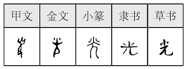 *光guāng6画 小部 (1) 照在物体上,使人能看见物体的那种物质,如太阳光、灯光、火光等,即人的视觉能感知的电磁波。还包括看不见的红外线和紫外线。 (2) 明亮: ~明|~辉|~灿灿。 (3) 风采: 容~焕发。 (4) 荣耀;荣誉: ~荣|为国争~。 (5) 比喻恩惠、好处: 借~|叨(tāo)~|沾~。 (6) 景色;景物: 风~|观~|春~明媚|湖~山色。 (7) 滑溜: ~滑|磨~|这种纸很~。 (8) 裸露: ~头|~脚|~着身子。 (9) 完;尽;一点不剩: 精~|用~|一扫而~。 (10) 使发展: 发扬~大。 (11) 敬辞,表示光荣,用于对方来临: ~顾|~临。 (12) 副词。只;单;仅仅: 不能~说不做|~靠我一个人怎么行? 光 ☚ 炫 熱 ☛ 光guāng甲骨文、金文和小篆是会意字,“火”在“人”(儿)头上,光明义。隶楷讹作“光”。用现代的解释就是能引起视觉的电磁波。如:灯光|阳光(还有看不见的电磁波,如红外线、紫外线等)。组词如:光明。引申为光荣,荣誉。如:为国争光。组词如:光荣。敬辞如:光临|光顾。引申比喻景物。如:春光|风光|观光。组词如:光景。又引申为光滑,平滑。如:磨光。组词如:光溜。又引申为完了,一点不剩。如:消灭光。又指露着。如:光头|光膀子。又引申为单,只。如:光剩他一个人。 光★常◎常