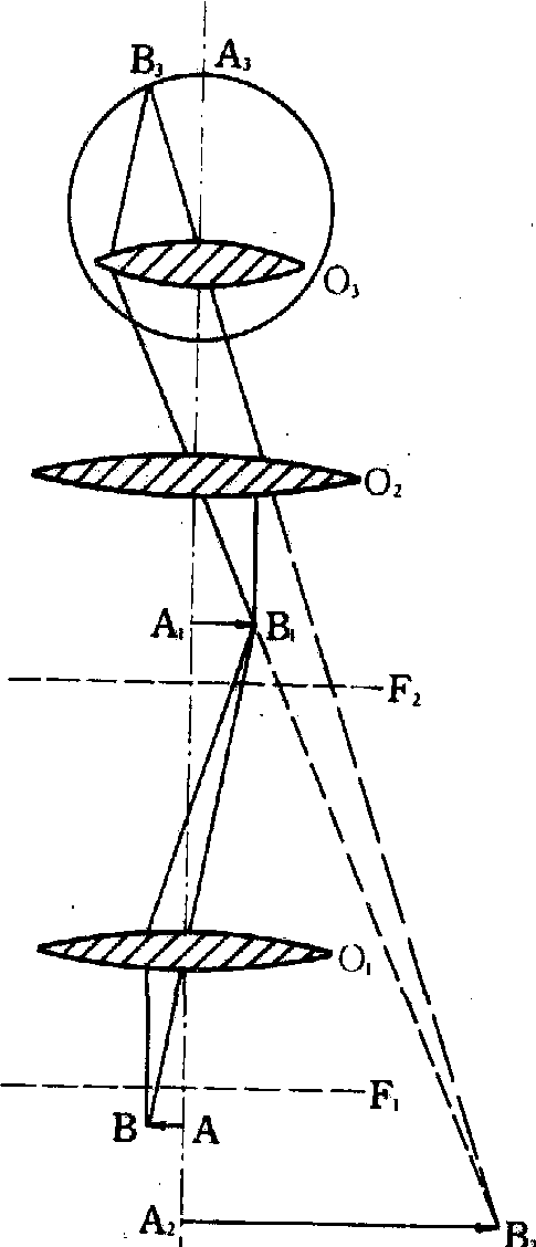 光学原理 即透镜的成像原理。物镜和目镜的结构虽然复杂,但二者均相当于一块凸透镜。将被检物AB放在物镜(O1)的前焦面(F1)之外,则在物镜上方形成一个倒立的放大实像A1B1,正好在目镜(O2)的焦面(F2)之内; 目镜(O2) 再对A1B1进一步放大而形成虚像A2B2;当眼睛在目镜上方观察时,A2B2通过眼睛的晶状体(O3)映在后方的视网膜上形成A3B3,最终使人感知显微镜放大物像的存在 (图2)。 分辨力 又称分辨率或分辨本领。指显微镜能把两物点分开的最小距离(分辨距离)的能力。分辨距离越小,分辨力越强。分辨距离(d)与照明光的波长(λ)和物镜的镜口率(NA)的关系可用公式d=0.61λ/NA表示。若取可见光平均波长550nm为照明光波长,并使用镜口率为1.25的油镜,则其分辨距离为270nm。此值为普通光学显微镜的最大分辨力,约等于照明光波长的一半。若用可见光中波长最短的紫色光(波长约为400nm)作为照明光,则分辨距离约为200nm,此值为普通光学显微镜的分辨极一限。 放大率 也称放大倍数。在标准光学筒长条件下,显微镜总放大率等于目镜和物镜放大倍数的乘积。总放大率可随光学筒长的增加和目镜放大倍数的提高而增加。但由于分辨率由照明光波长和物镜镜口率所决定,靠提高光学筒长和目镜放大倍数并不能提高显微镜的分辨率。一般有效放大率的上限是物镜的镜口率乘以1000,下限乘以250。根据这个范围,使用一种物镜,要选择与其相适应的目镜,以保证显微镜的有效放大率。如果单方面提高目镜的放大倍数超过了有效放大率的上限,即造成无效放大,不但无用,反而会降低物像的清晰度; 如果降低目镜放大倍数,使总放大率低于有效放大率下限,就无法充分利用物镜的分辨本领,使显微镜的分辨率降低。例如,根据理论和技术极限,浸润系物镜最高镜口率为1.40,而干燥系最高镜口率为0.95,故光学显微镜的有效放大倍率的上限干燥系物镜为950×,浸润系物镜为1 400×,若用镜口率为0.95、放大60×的物镜时,配用的目镜不得超过15×(15×60=900×);若用镜口率为1.40、放大100×的油镜时,所配用的目镜以不超过14×为宜(14×100=1400×)。 清晰度 指显微镜造成物像轮廓明显与否的能力,主要取决于物镜。影响物像清晰度的因素较多,如不同色光可以造成色差、透镜本身可以造成像差、盖玻片过厚过薄、镜口率和光学筒长不合标准等都能影响物像清晰度。 应用 用于观察标本的微细形态结构,从而获得肉眼不能分辨的物体细节,如观察细胞和组织的形态结构等。生物体有的可以直接置于显微镜下观察,如观察原生动物或多细胞生物分散细胞的形态和生命活动; 也可以做成合乎一定要求的标本如切片、涂片、铺片和撕片,经过染色,然后借助于显微镜进行观察;还可以结合其他学科的专门技术如细胞和组织化学技术等,对被检物作特殊处理,以便研究其化学成分及机能。在动物学、植物学、微生物学、细胞学、组织学、胚胎学、遗传学及其他凡是需要研究显微形态结构的领域,都离不开显微镜。 光学显微镜light microscope用可见光作光源对肉眼难于分辨的微小物体进行放大观察的光学仪器。由光学部分和机械部分组成。光学部分有反光镜、聚光镜、物镜、目镜及镜筒组成透镜系统;机械部分有镜架、载物台和各种调节装置。有的附有光源装置和照像系统。透镜系统的质量是决定光学显微镜的分辨能力、放大倍数、成像的清晰度和色差的纠正能力。一般光学显微镜的极限分辨限度为0.2 μm,比人眼高1 000倍。生物体有的可直接在显微镜下观察;有的需要做成合乎一定要求的标本,如切片、涂片、铺片和撕片,或经过染色,才能进行观察。还可以结合其他技术,如组织化学技术等,对被检物作特殊处理,以研究其化学成分及机能。 光学显微镜 光学显微镜guangxuexianweijing用以获得微小的物体或物体微细部分的放大像,以便进行观察的精密仪器。中学生物实验室里常用的是光学显微镜,它是由9组透镜组成的,所以也称“复式显微镜”。显微镜的结构比较复杂,放大倍数可从数十倍至1000多倍,常用的是放大100多倍至600倍左右。显微镜是生物实验里必备的较贵重的仪器。 ☚ 装片 培养基 ☛ 光学显微镜一类光学仪器。以可见光为光源,用玻璃制作透镜的显微镜。常见的有单式显微镜与复式显微镜两类。前者构造简单,放大倍数在10倍以下。构造稍复杂的单式显微镜为解剖显微镜,其放大倍数在200倍以下。它们放大的物象都是方向一致的虚象,即直立的虚象。复式显微镜结构较复杂,放大倍数可达1250倍,最高分辨力为0.2微米。如普通生物显微镜、暗视野显微镜、相差显微镜、荧光显微镜等。 |