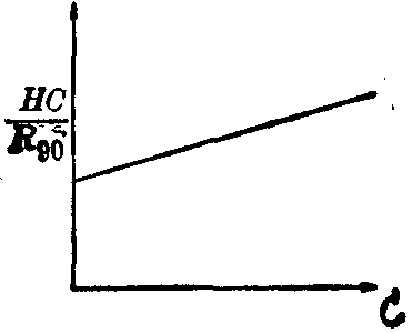 图4 微粒尺寸小于波长二十分之一时,HC/R90对浓度C的图 下测量R90的值,然后以HC/R90对浓度C作图(图4)。图呈一直线,直线的斜率为2B,在纵轴上的截距就是分子量的倒数。如果微粒尺寸比入射光波长二十分之一大时,由于散射光发生内干涉使散射光减弱,减弱程度与散射角有关,故需按下列方程式计算分子量: