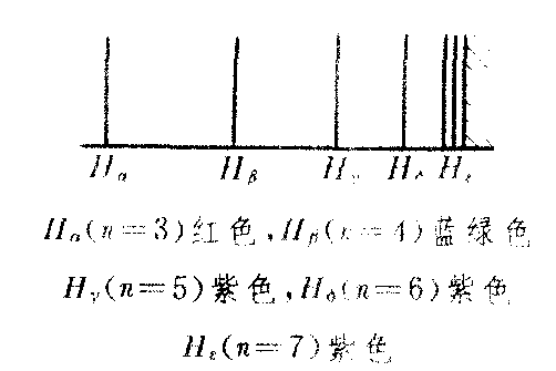 原子、分子光谱中的谱线按一定规律分成若干个组,每组称为一个线系。在同一线系中,各谱线的波长(或频率)往往可以用一简单的公式表示。例如氢原子光谱有5个线系,其中最著名的巴尔末线系在可见光区,如图所示,各谱线波长λ满足:1/λ=RH(1/22-1/n2),式中RH=109677.581/厘米,叫里德伯常数;n可取大于等于3的一切整数,每个整数代表一条谱线。氢光谱的其余4个线系也可用上式表示,但式中的1/22要改成1、1/32、1/42、1/52,而整数n分别从2、4、5、6开始取值。类氢原子发射的光谱线系也能用类似巴尔末系的公式表示。光谱的线系结构反映出原子、分子的能级结构。外壳层电子数相同的原子具有相似的线系结构,表示线系的公式也类似。获得某样品的光谱线系,是对其进行光谱分析的基础。