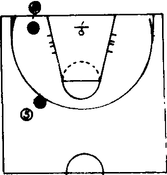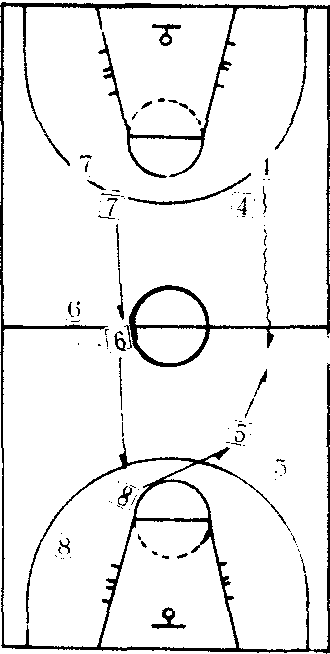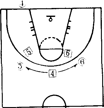 3对3防掷界外球 防守队员应尽量争取断球或造成对方5秒违例。❸3对3防掷界外球练习。 ❺、 ❻不让 ❺、 ❻迎前接球, ❹伺机夹击和断球。 ❹补防练习。当防守出现漏人时,邻近的防守队员必须及时进行补防。应迅速调整位置,伺机抢断球。 ❺全场3对3、4对4、5对5的攻防练习。防守队员利用夹击、补防等配合进行防守。