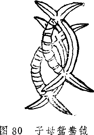 八卦钺即子母鸳鸯钺。是八卦门器械之一。套路名称有蟒行钺、狮滚钺、虎扑钺、熊背钺、蛇缠钺、马刨钺、猴戏钺、鹏展钺。每一形钺是一趟,八趟为一套,每趟钺二十四式,共计一百九十二式。每形不同,套路不重。走的是劈、削、挑、撩、推、拉、缠、挂八个劲(图80)。