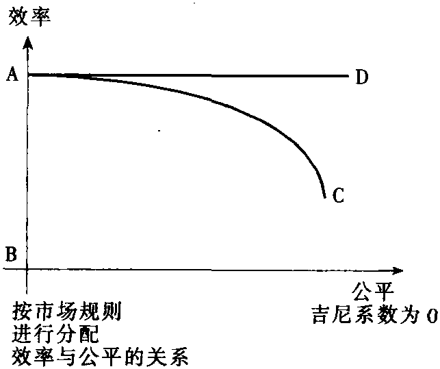 福利经济学认为,要使收入分配更公平一些,就要在一定程度上放弃效率,要获得较大的效率就要忍受某种程度的不公平。效率与公平之间的关系可以用下图来说明。图中,纵轴表示效率,A点是在完全竞争条件下能达到的最高效率水平,横轴表示以吉尼系数衡量的公平,B点是按市场规划进行的分配。如效率与公平的关系表现为图中的AD线,只要对个人的初始资源份额进行调整,社会就可以在不损失效率的条件下达到任何一种收入分配状态。然而从现实的观点来看,效率与公平之间存在着交换关系,改变收入分配将使效率受到损失,二者之间的关系表现为图中AC线。显然,如果认为效率与公平是不矛盾的,它们之间关系如图中AD线所表示的那样,那么政府的收入再分配活动在理论上就不会有任何界限。一旦承认现实中效率与公平有一种交换关系,那么政府的收入再分配活动就会受到制约,对公平的追求就要考虑到效率上的损失。
